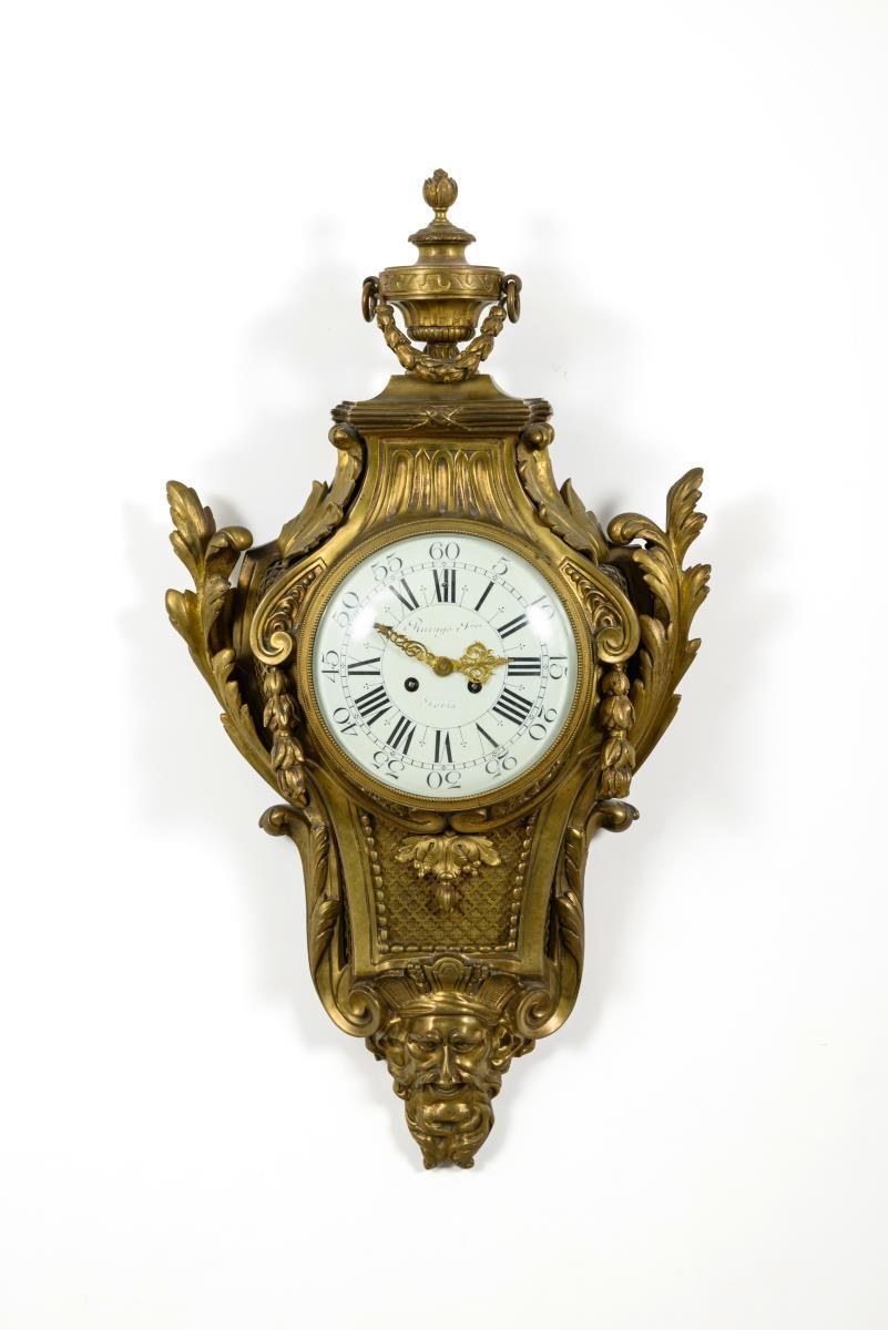 Historicizing wall clock with vase finial and mascaron. Vase finial loosened, slight signs of age.