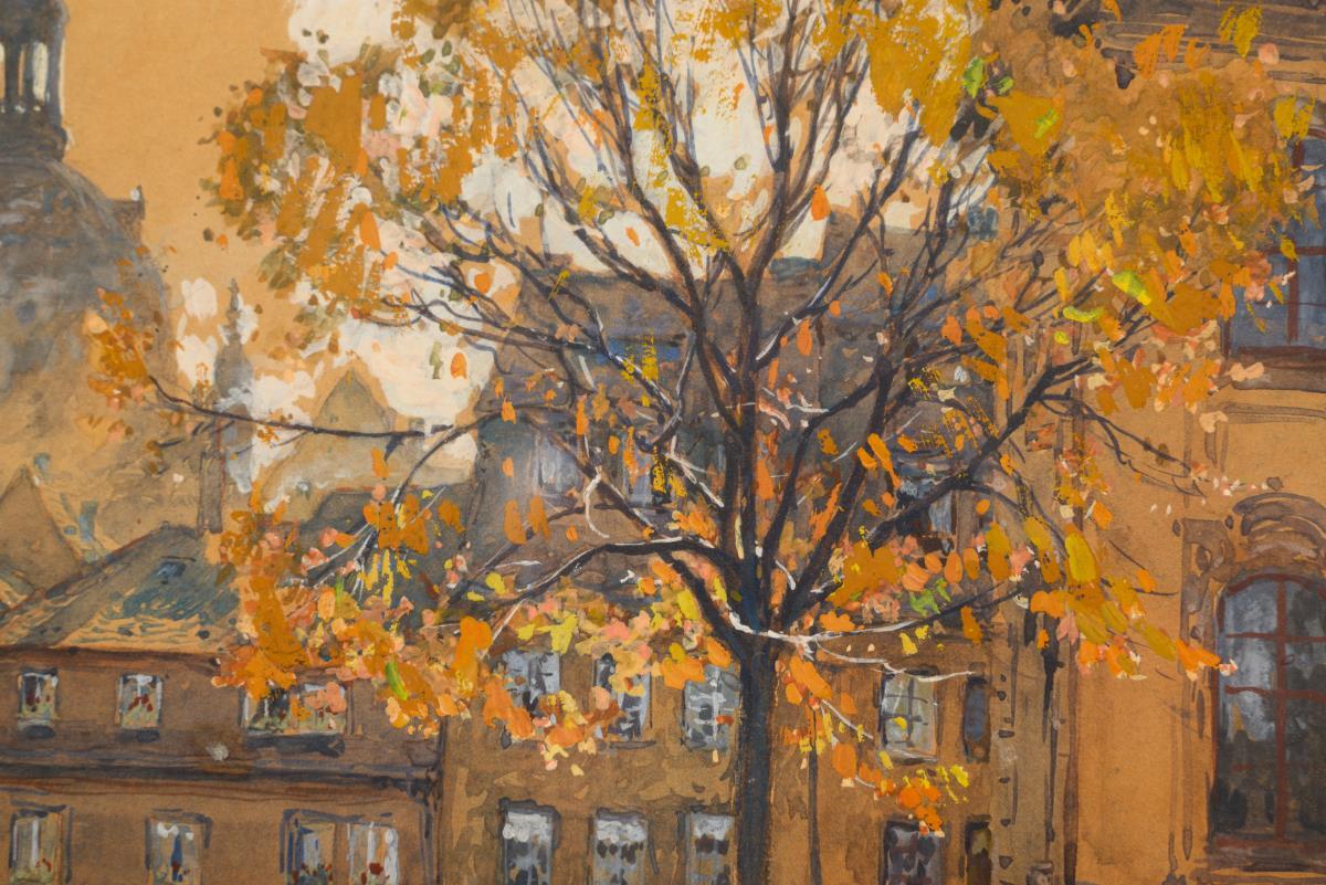View from a terrace with an autumnal tree over the roofs of the Saxon city with the Frauenkirche on the horizon.