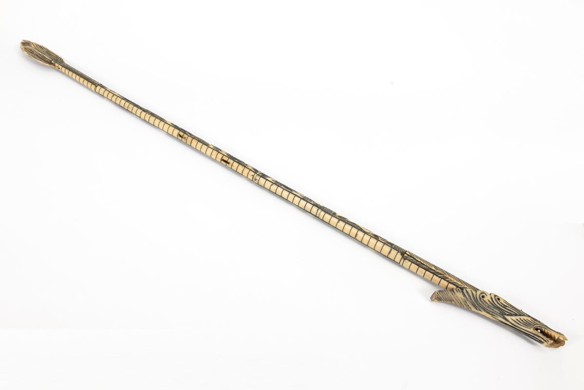 Segments decorated with blackened incised drawings, connected by a metal tube. Removable dragon head and tail. Parts missing from the head and the underside of the "belly". Referred to in tradition as a blowpipe.