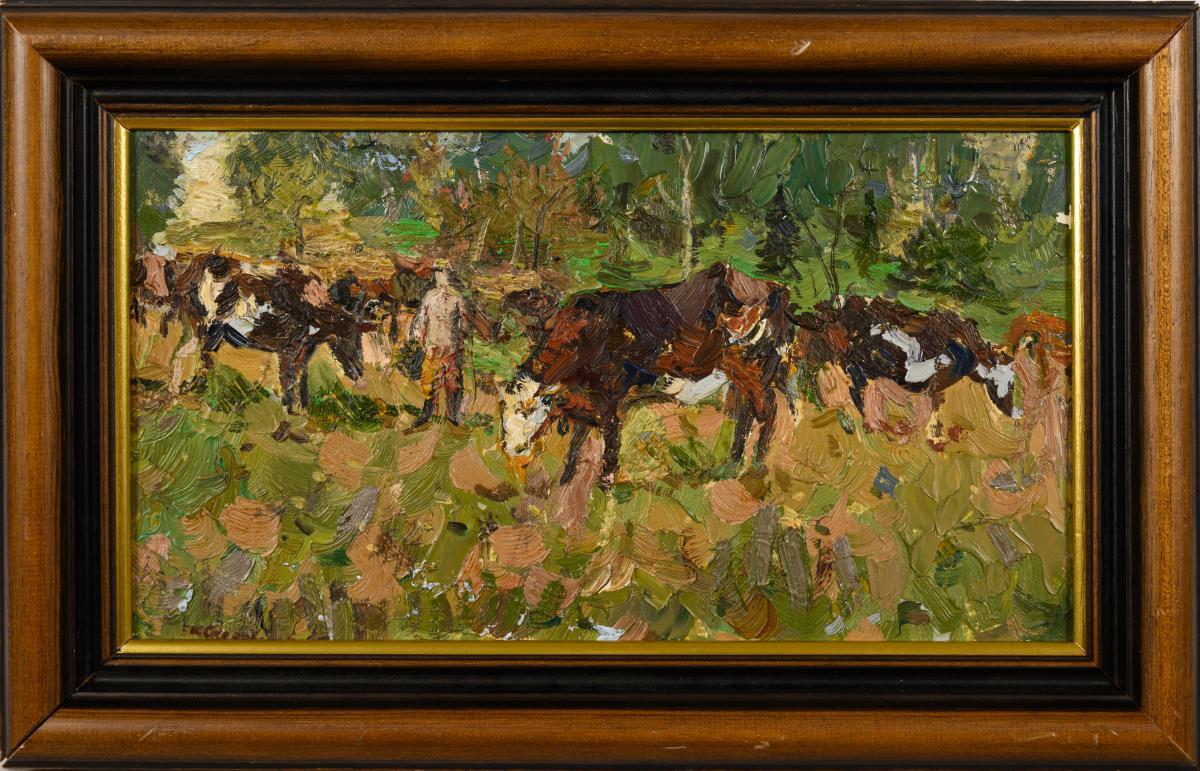 Oil/painting card. Signed in Cyrillic lower left, verso inscribed in Cyrillic. 1957.