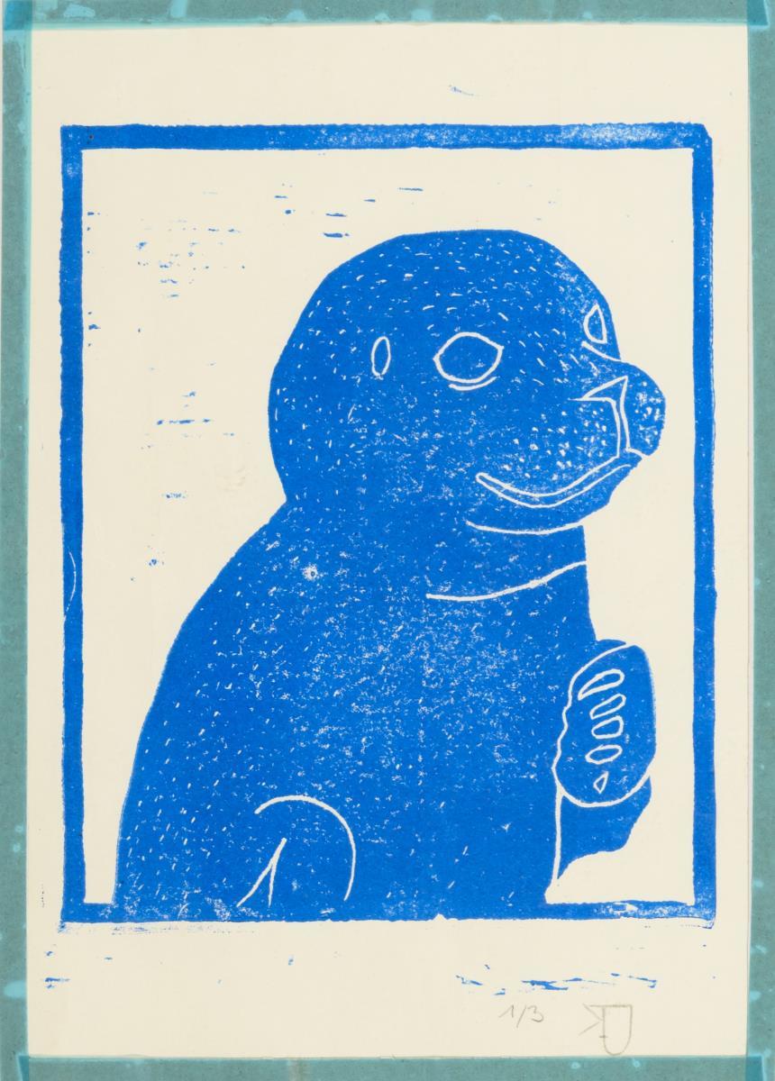Linoleum cut in blue. Pencil monogram. Copy: 1/3.