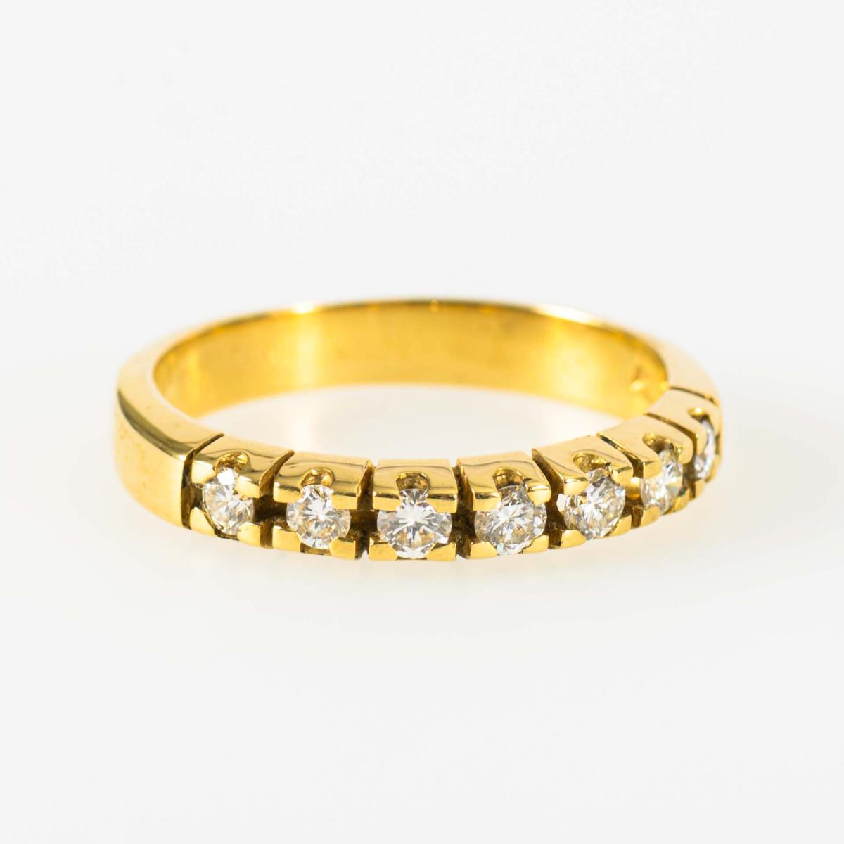 Marked 750 yellow gold. Diamonds in total approx. 0.35 ct. White/vs-vvs. ring size 60. 5,4 g.
