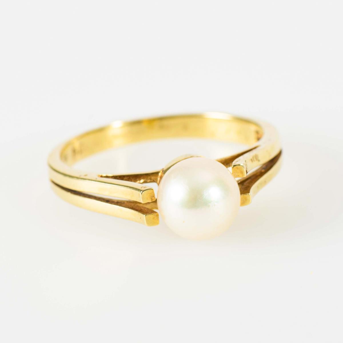 Marked yellow gold 585. Pearl Ø 7.5 mm. Ring size 60. 3.8 g.