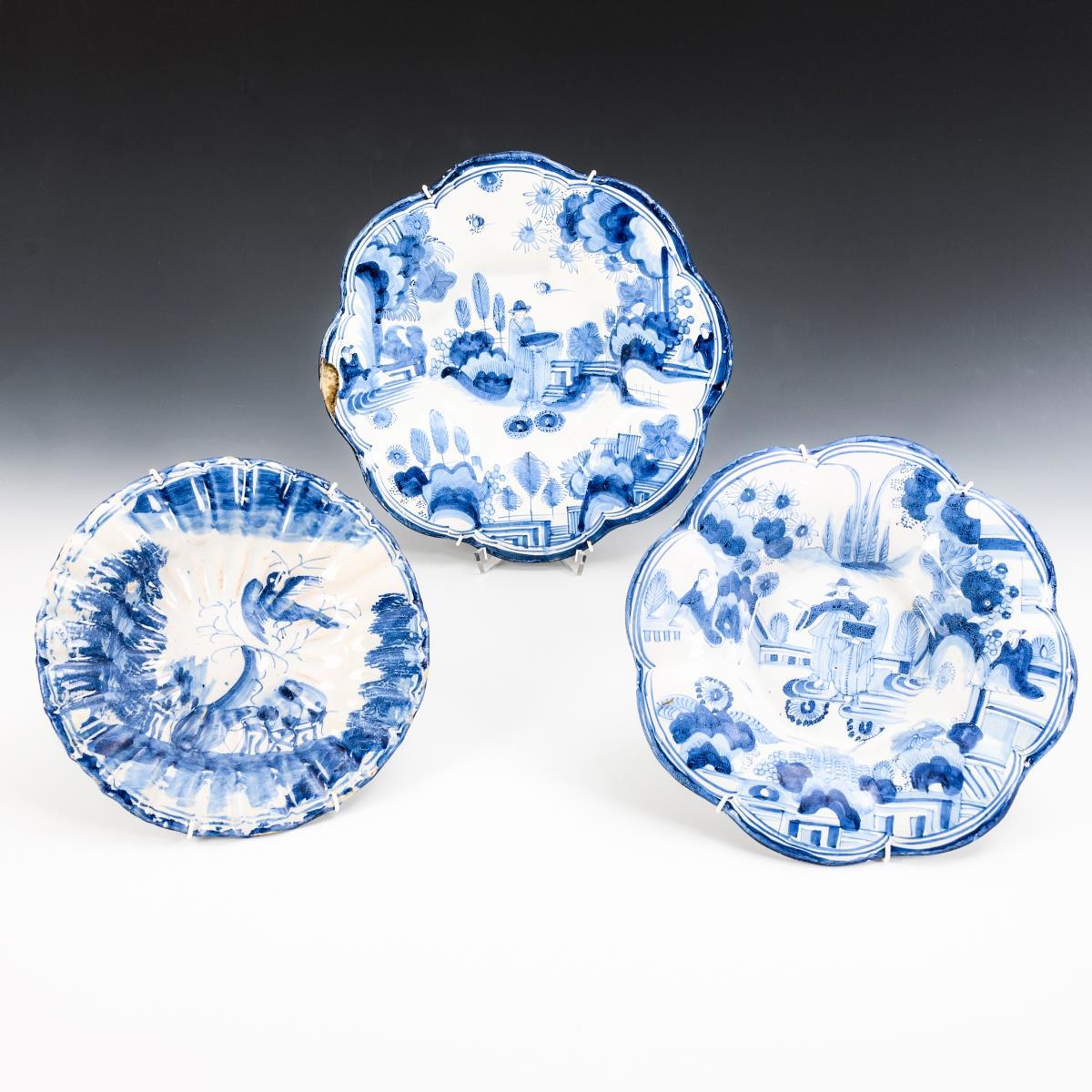 2 small humped plates with chinoiseries and 1 fan-shaped plate with bird motif in landscape. Each with recently added suspension. Partially bumped and rubbed, 1 plate with hairline crack.