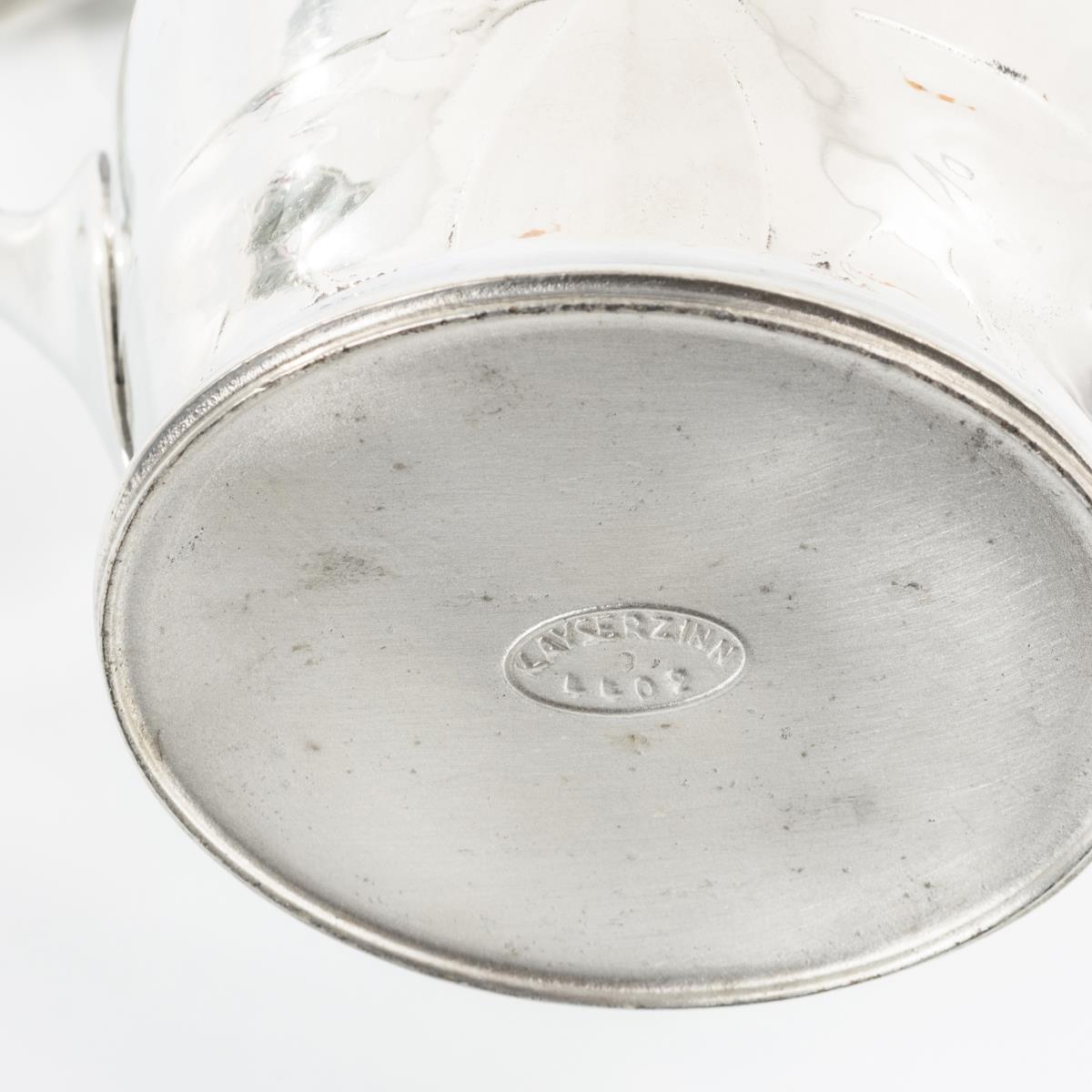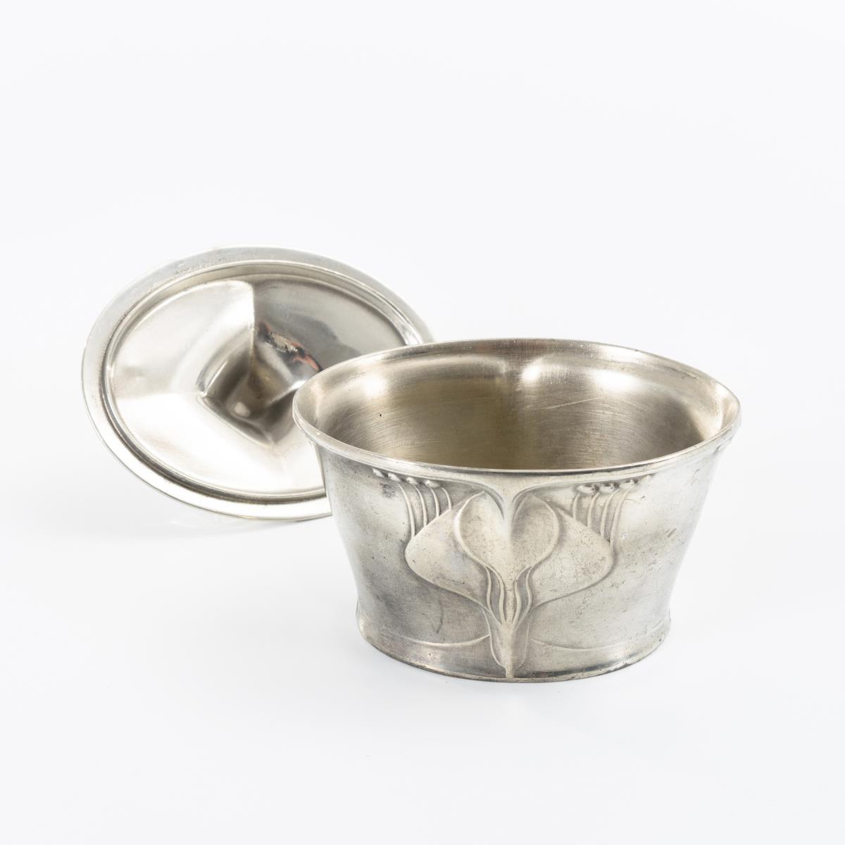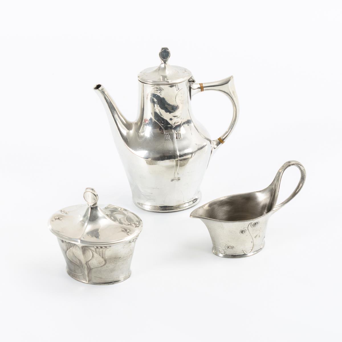 Deckel sowie Sahnegießer, je mit stilisiertem und variierendem Blütenmotiv.
