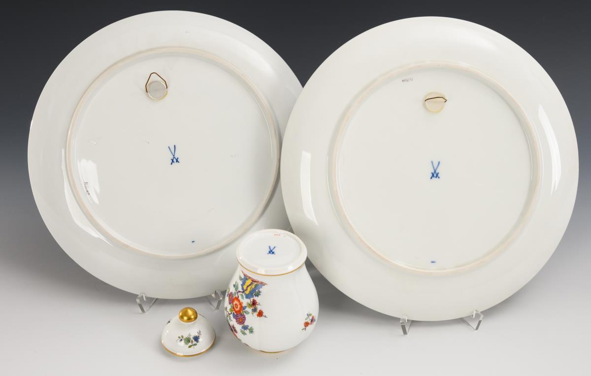 2 wall plates and 1 lidded vase with Kakiemon painting. Meissen.