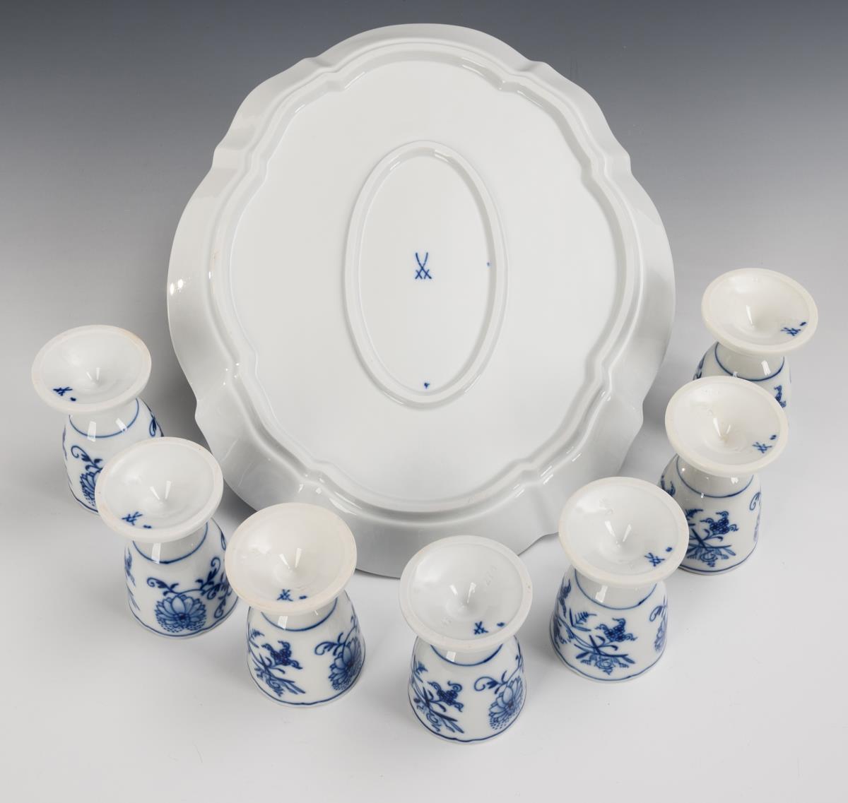 Underglaze blue painting. 7 egg cups (H 7 cm) and 1 tabette (L 27.5 cm).