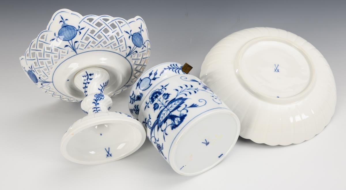 Onion pattern bowl, centerpiece and coffee tin. Meissen.
