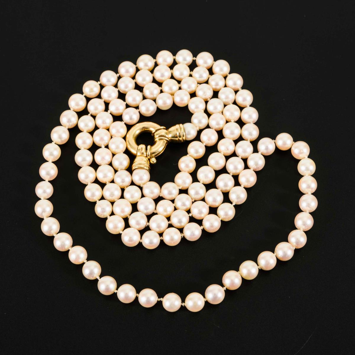 Marked 585 yellow gold clasp. Pearls Ø 7 mm. L 106 cm. 83,4 g.