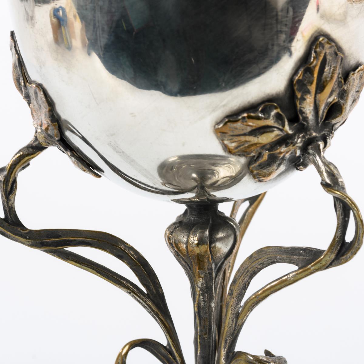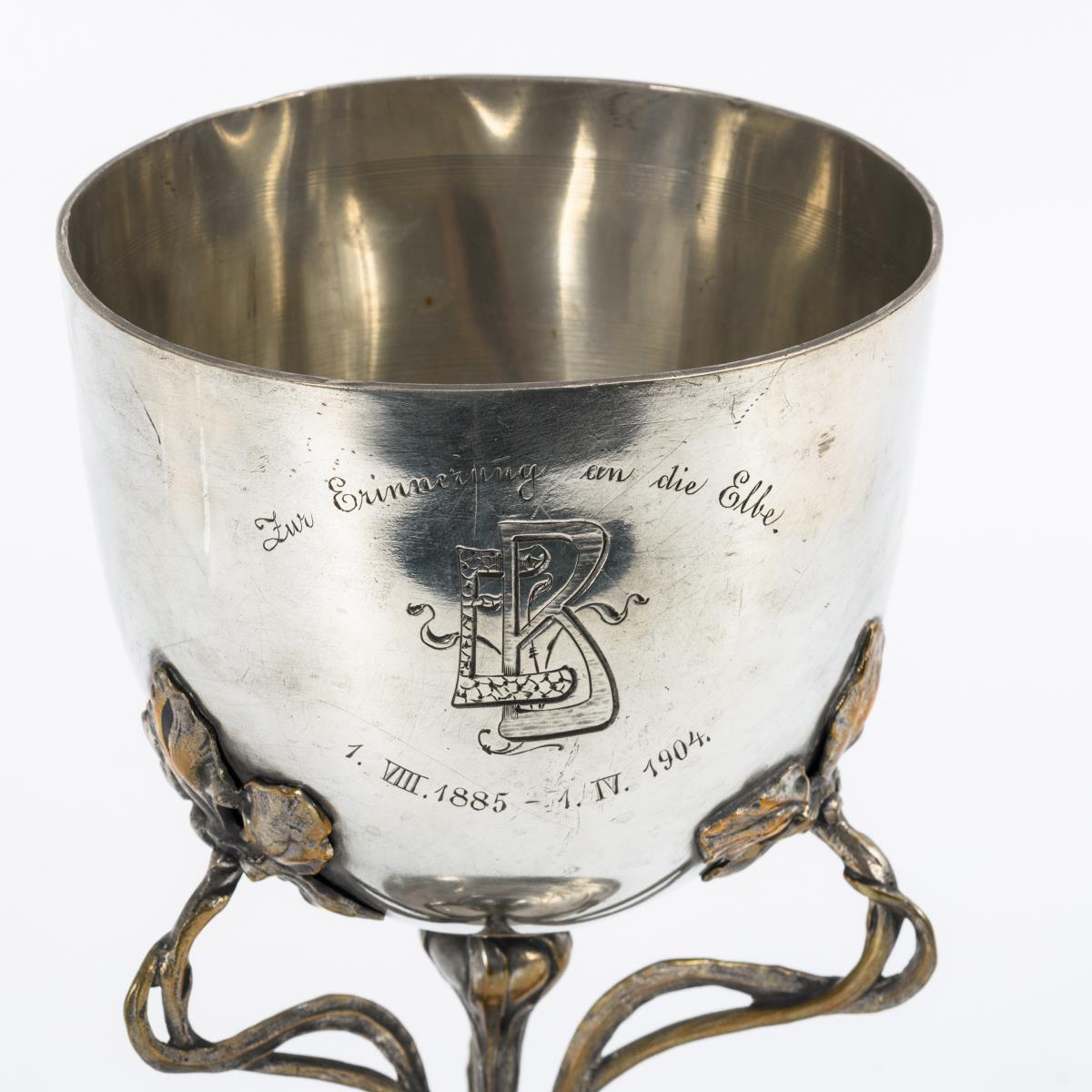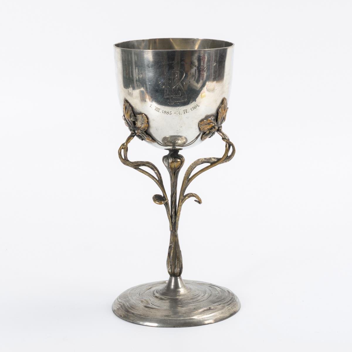 Schaft aus verzinnter Bronze, ungemarkt. H 30,5 cm. Hoher Pokal auf reliefiertem Scheibenfuß und von Irisstängeln getragene Kuppa, Kuppa mit gravierter Widmung von 1904 und Monogramm EB. Einige Alters- und Gebrauchsspuren..