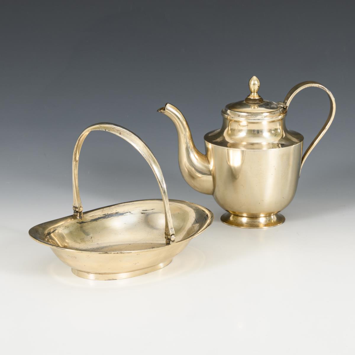 Simple small mocha pot with hinged lid and strap handle. Minimally dented, traces of soldering on the base. H 14.5 cm. / Oval bowl with handle. Scratch marks. 4 x 18 x 13 cm, h with handle 13 cm.