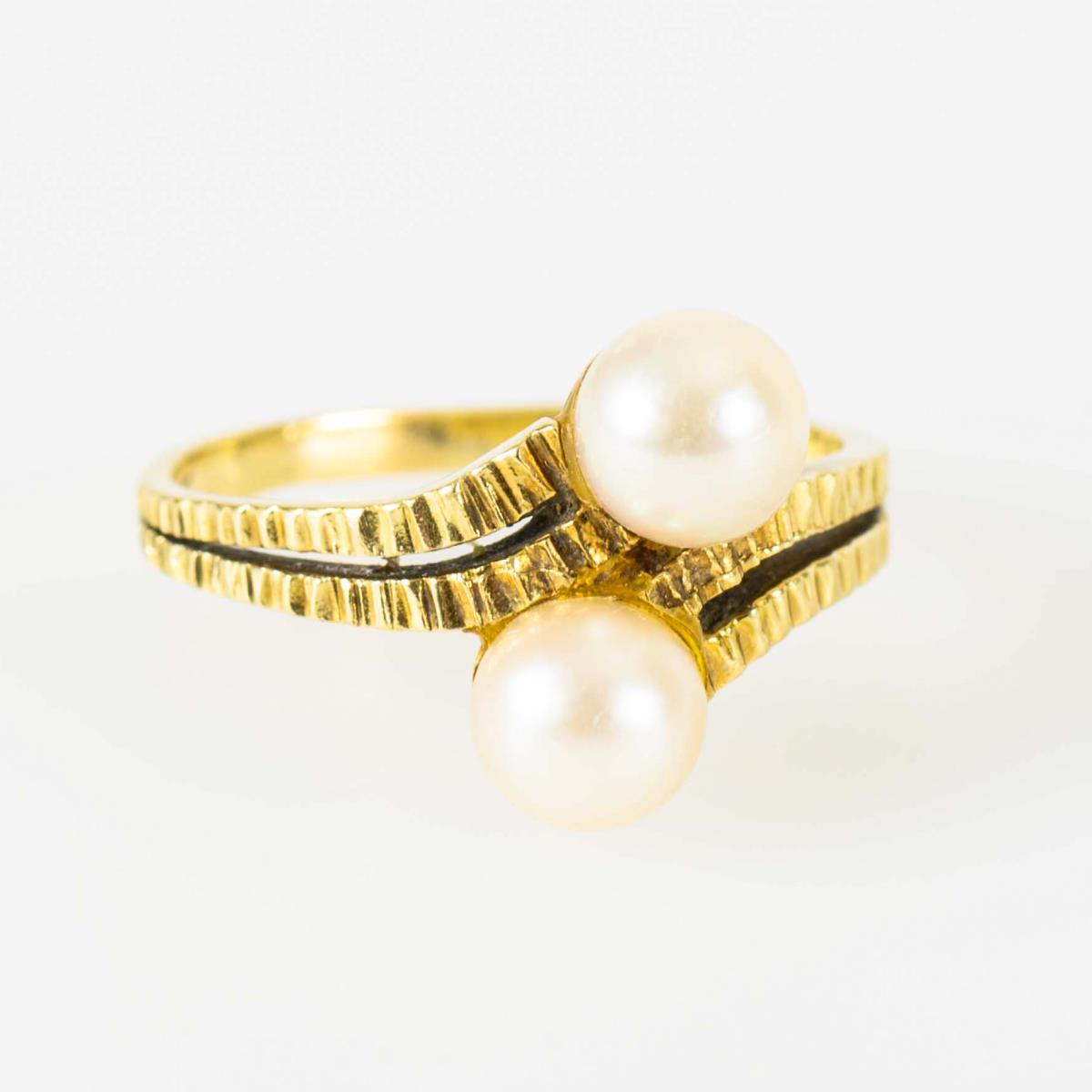2 cultured pearls between structured ring center and narrow shank.