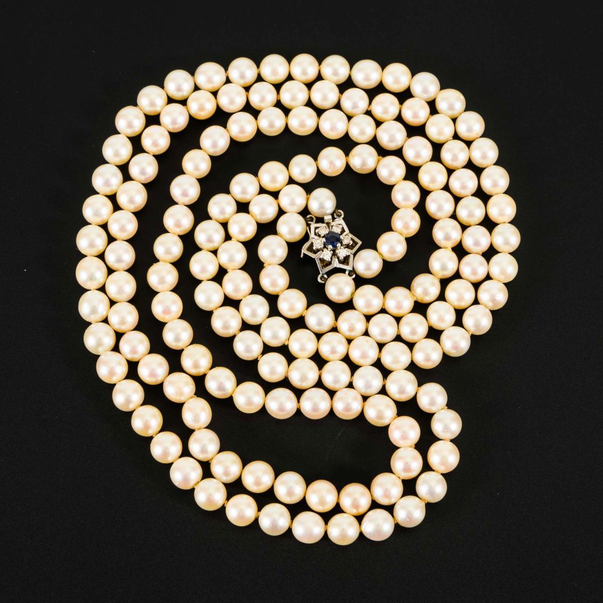 Lace-up necklaces with cultured pearls in individual knots on a flower clasp with chaton-set sapphire, 6 small brilliant-cut diamonds and figure-of-eight clasp.