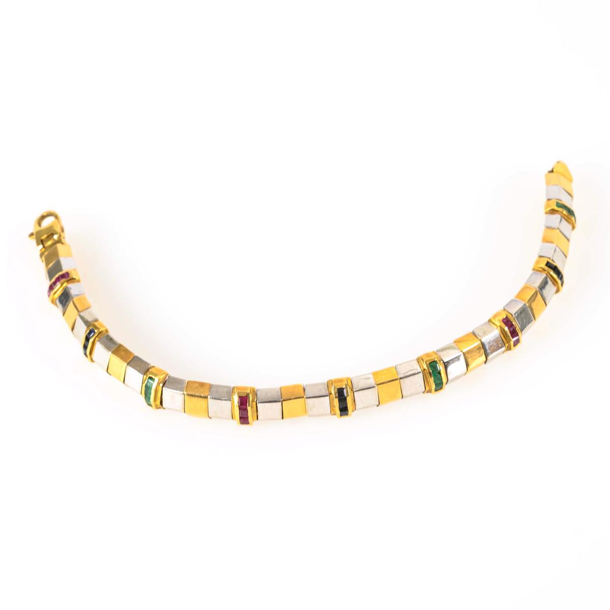 Link bracelet, each with 9 set colored stone carrés, on lobster clasp.