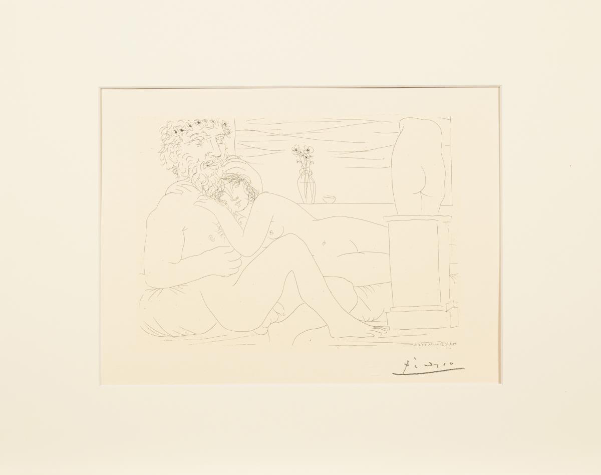 Resting sculptor and model looking at a torso, copyright stamp on verso "Pablo Picasso - Suite Vollard, Bloch Nr. 162, VG Bild-Kunst, Bonn 1990".