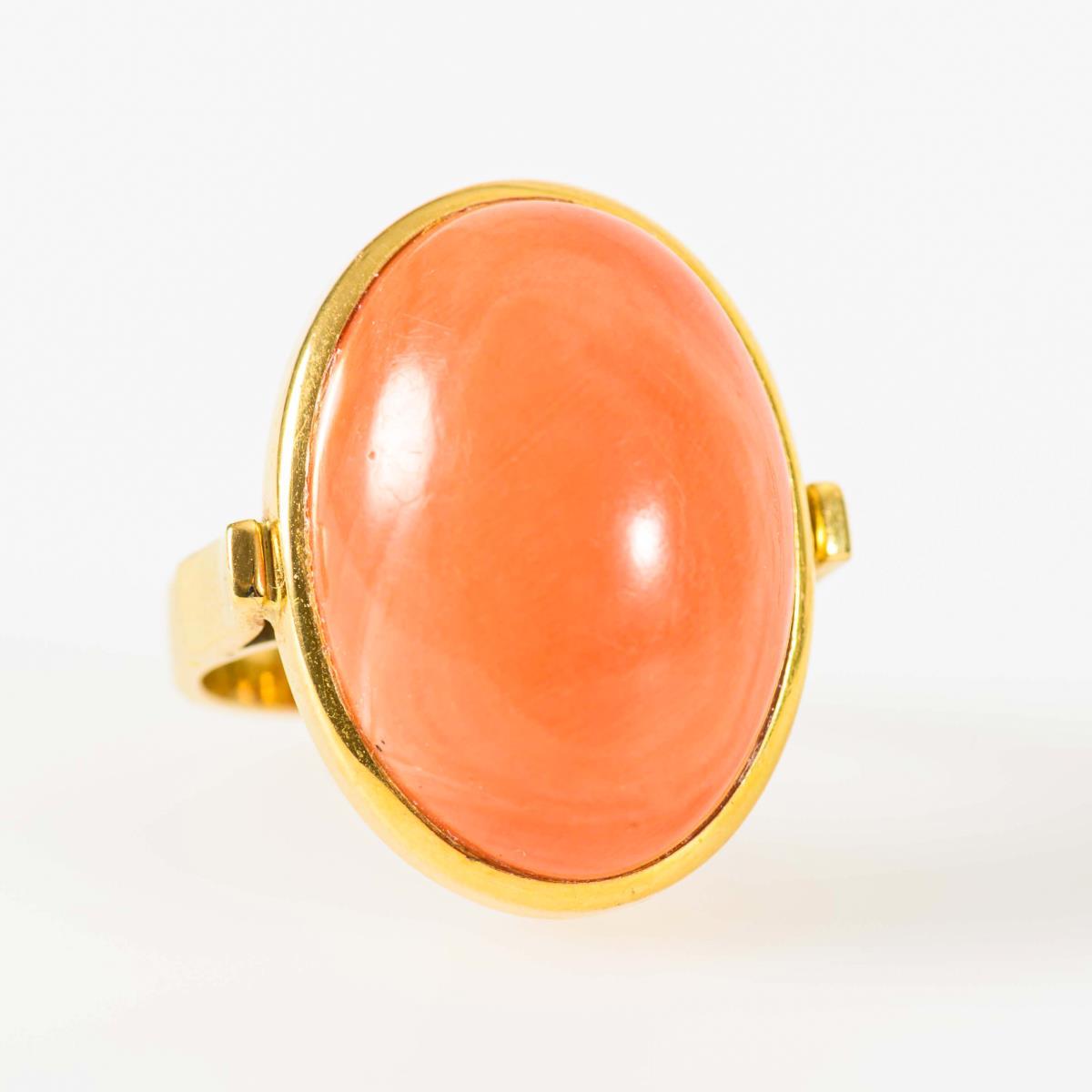 Stamped 585 yellow gold. Coral 2.3 x 1.6 cm. Ring size 54. 11.9 g.