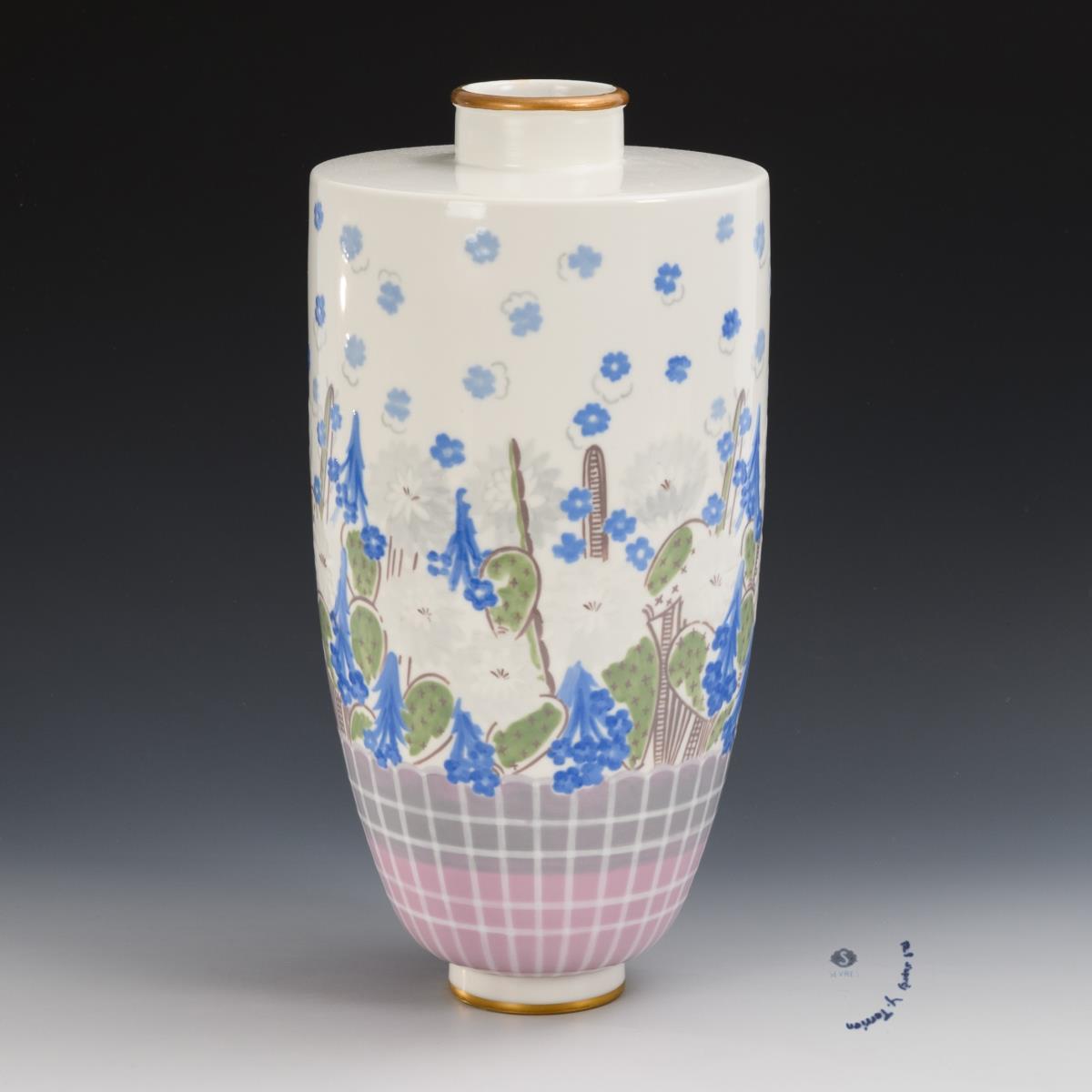 Tall, ovoid vase with cylindrical neck. Over a pink-grey checked pattern, stylized floral painting with blooming opuntias and blue flowers. Neck and shoulder restored.