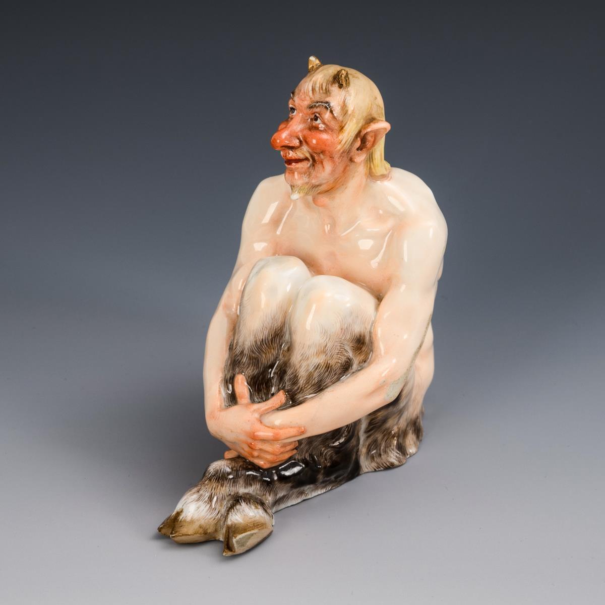 Sitting figure of a happy looking faun. 1 faun horn restored, 1 faun horn restored and minimally bumped, chip to the underside of the faun's tail, claws minimally bumped, abrasion to the left arm.