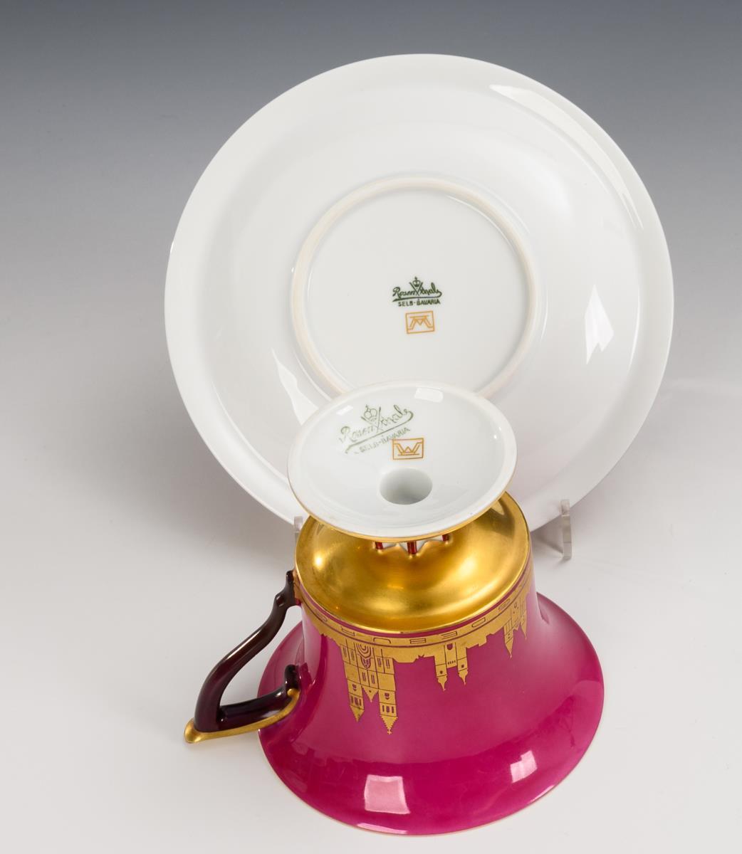 Footed crater cup with tapering handle and original saucer. Purple ground with gold decoration: all around the inscribed silhouette of the city of Magdeburg, in the mirror of the saucer the exhibition tower in Magdeburg designed by Albin Müller with the year "1927". Restored hairline crack on the rim of the cup.