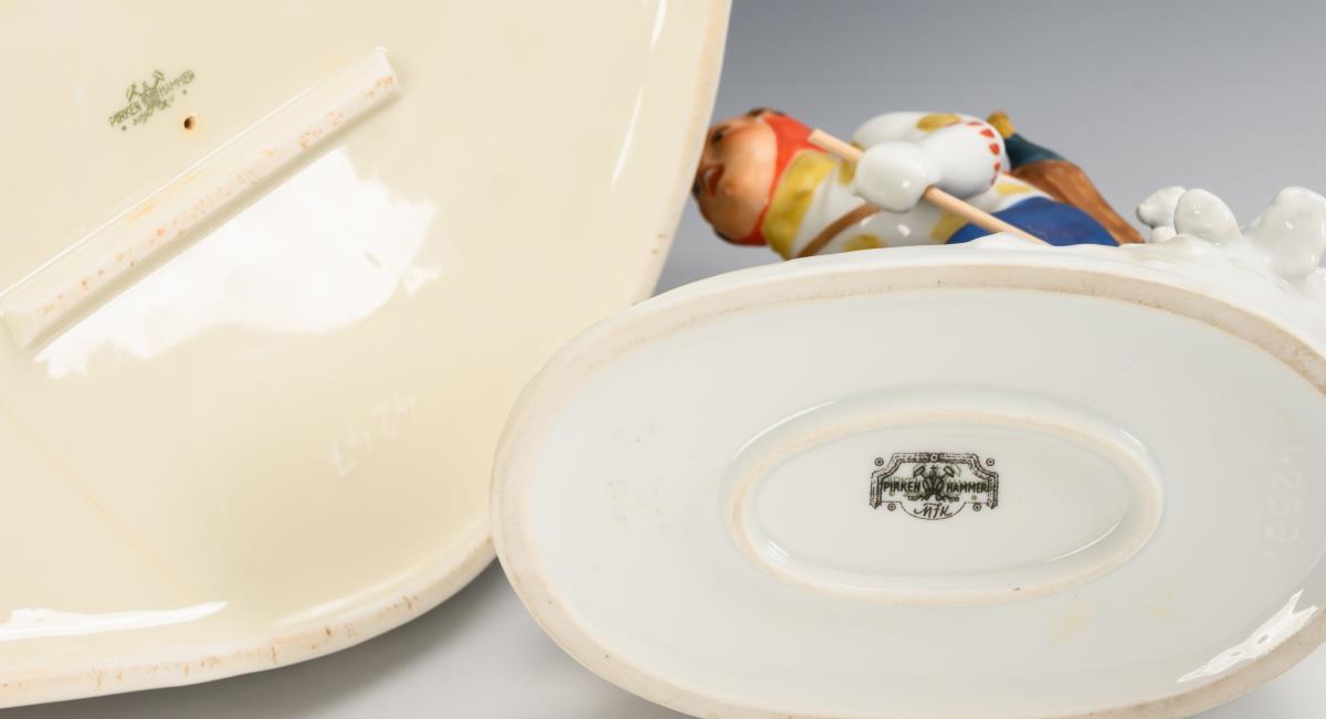 1x model no. 4253: Boy as skier, racing with a hare (h 15.5 cm). / 1x model no. 4247: young couple sitting together (H 18 cm). Hairline crack in the base of the couple, the tip of the boy's cap restored.