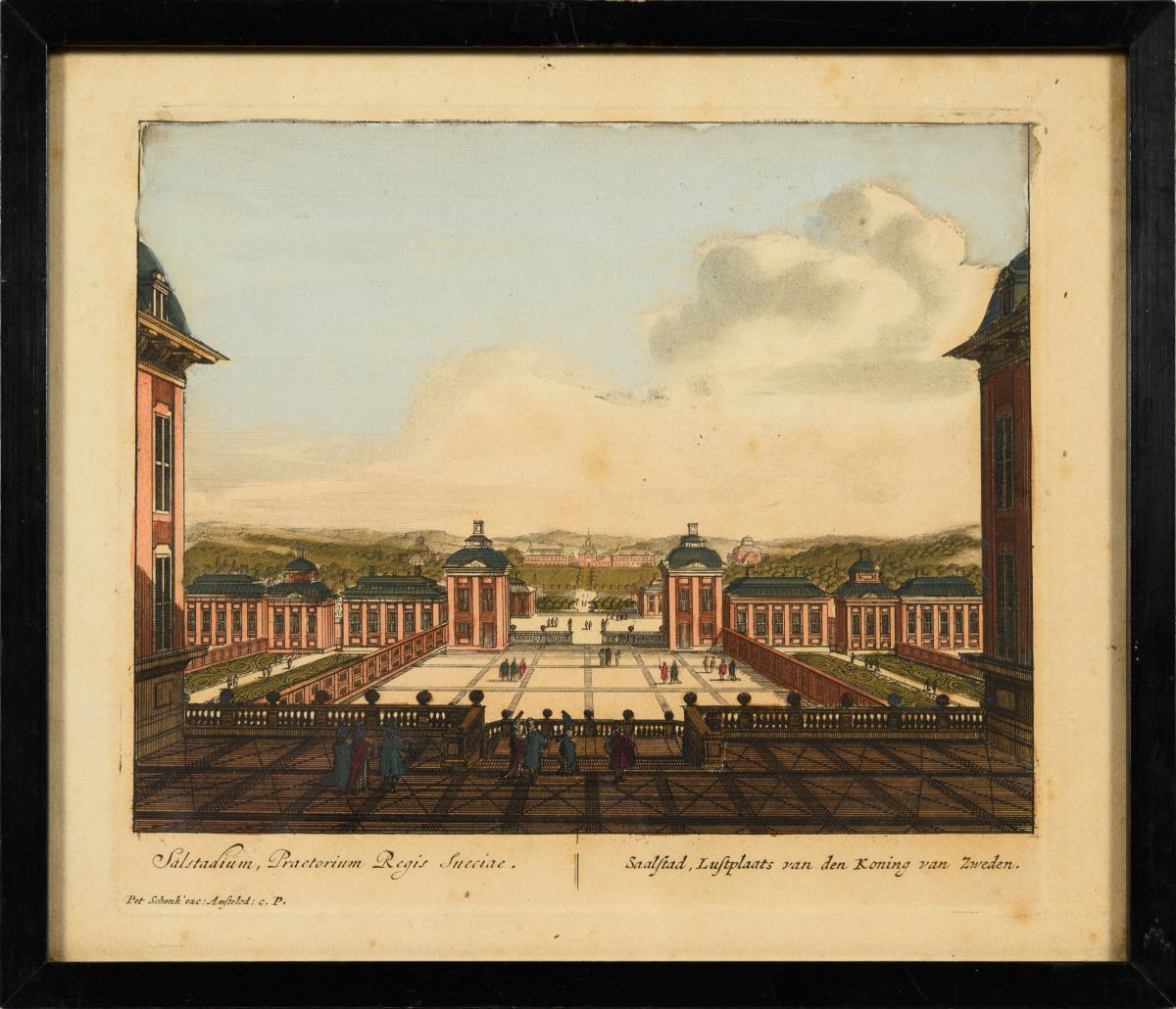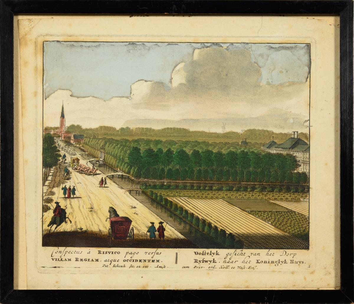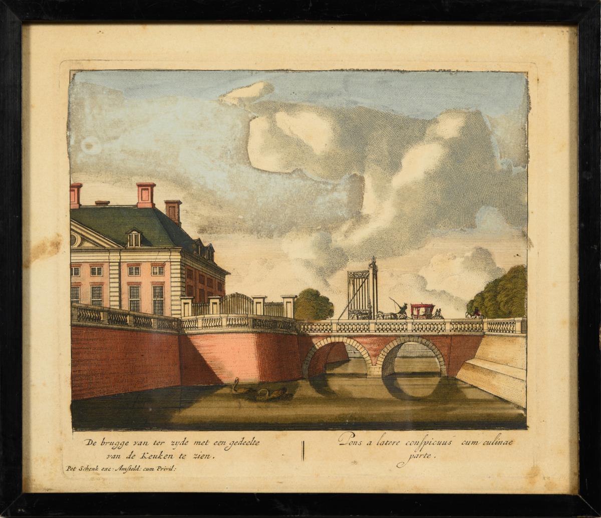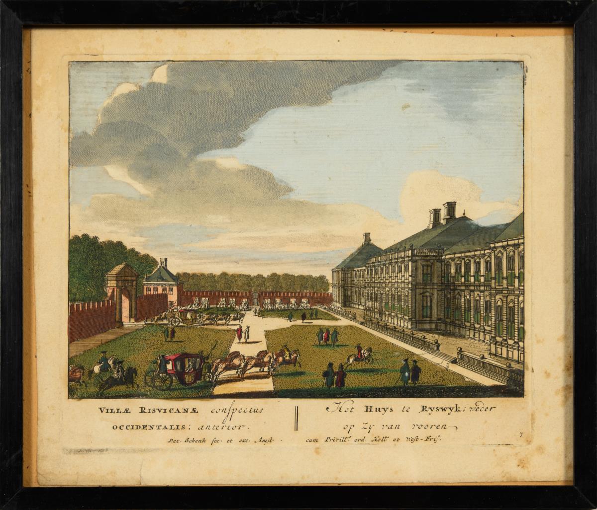 9 views of Dutch sights, inscribed in Dutch and Latin: "Oostelyk gesicht van het Dorp Ryswyk [...]" | "Dieren te zien van de Achtervyver van den Tarras tegens [...]" | "Arx Skogkloster van zyne Excellentie [...]" | "De niewe Port van St Honorius [...]" | "Asbeelding van den Marienberg in den Lusthof van St Iakobs Dal" | "Het Huys te Ryswyk [...]" | De brugge van ter zyde met een gedeelte van de Keuken te zien" | "Het Hoost van't Eilant van't Paleis nevens't gezigt den Kerke van onze Liewe Vrouwe." and "Saalstad, Lustplaats van den Koning van Zweden"; from: "Hecatompolis, sive Totius orbis Terrarum Oppida", 1702. Je with foxing and minor damage.