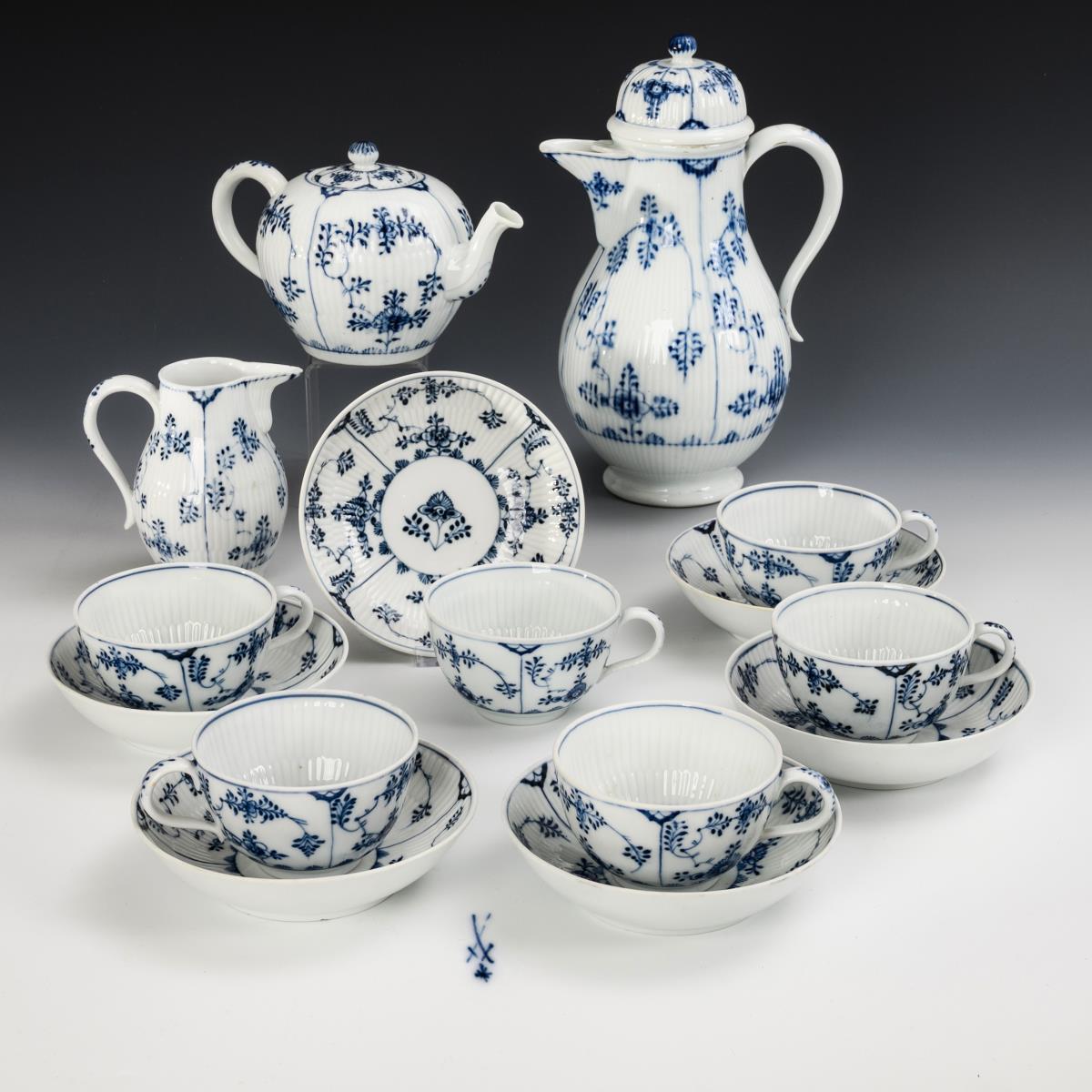 15 pieces. "Broken stick" shape. Coffee pot (h 27 cm), teapot (h 12 cm), milk jug, 6 cups (h 5.5 cm) and 6 saucers. 2 small chips to the rim of the coffee pot, chip to the rim of the milk jug and to 1 saucer rim, handle and lid of the teapot restored, 5 cup handles restored, hairline crack to 1 saucer.