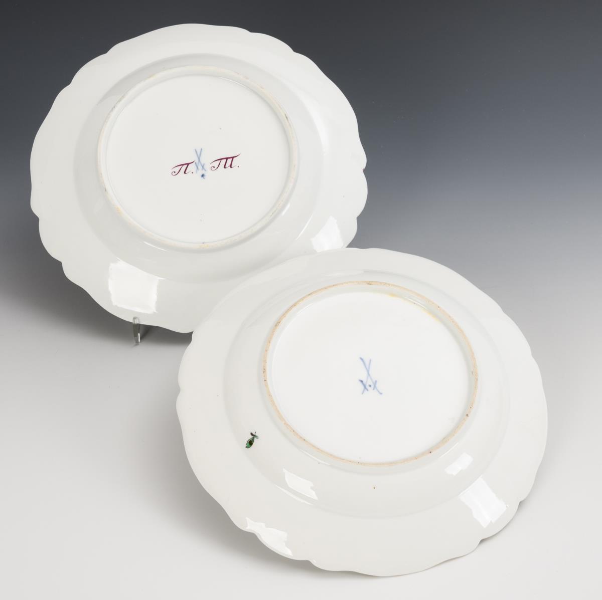 Shape "New cut-out". 1x 1763-1774: plate with copper-green flower painting and gold edge / 1x 1774-1814: plate with polychrome flower painting and the Cyrillic owner's monogram "PT". 1x gold rubbed.