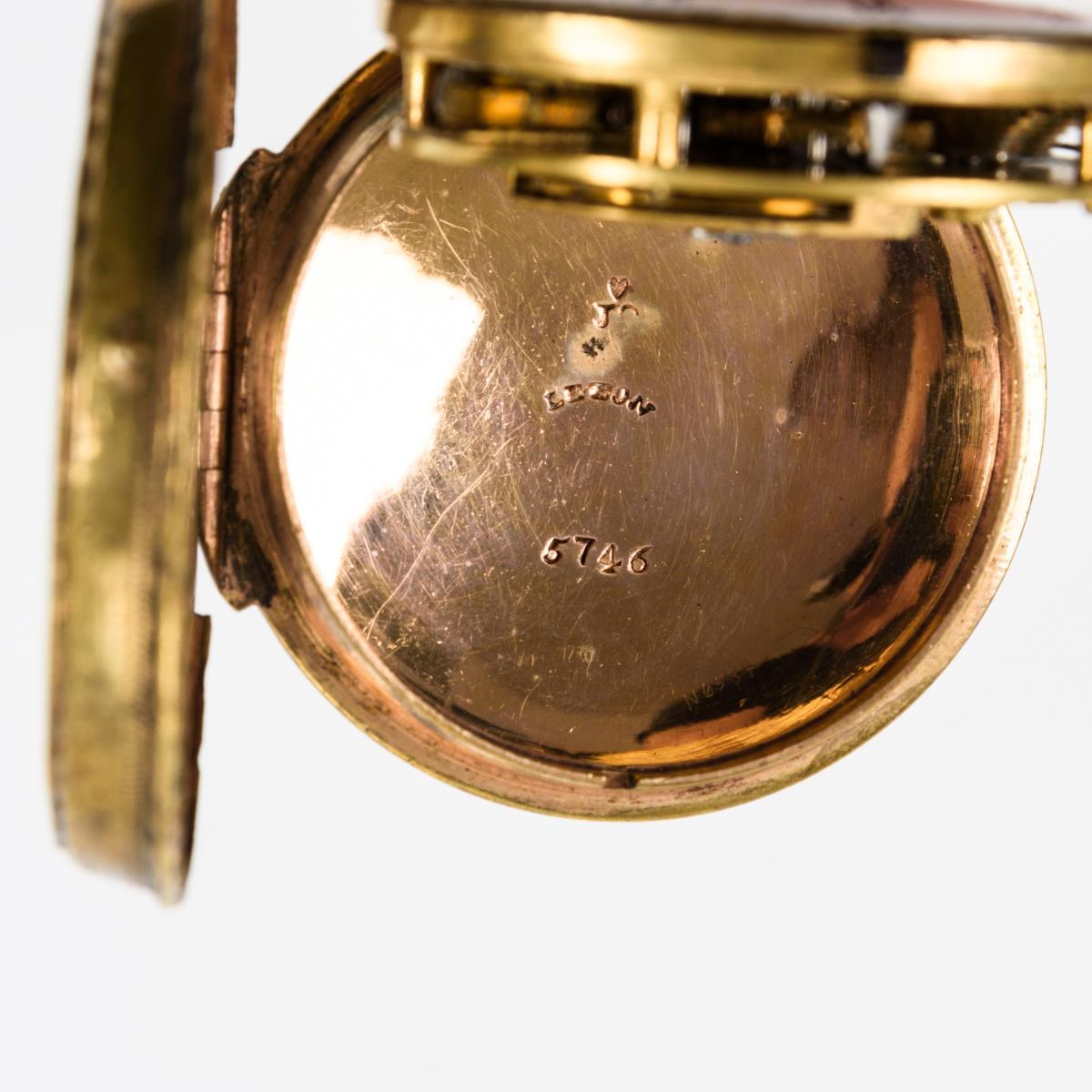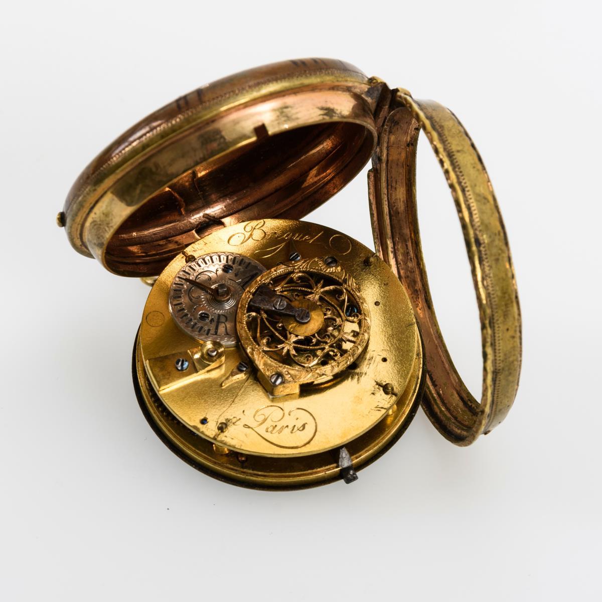 Vollplatinenwerk mit floral durchbrochener Unruhbrücke, Spindelgang, Kette und Schnecke, Schlüsselaufzug.