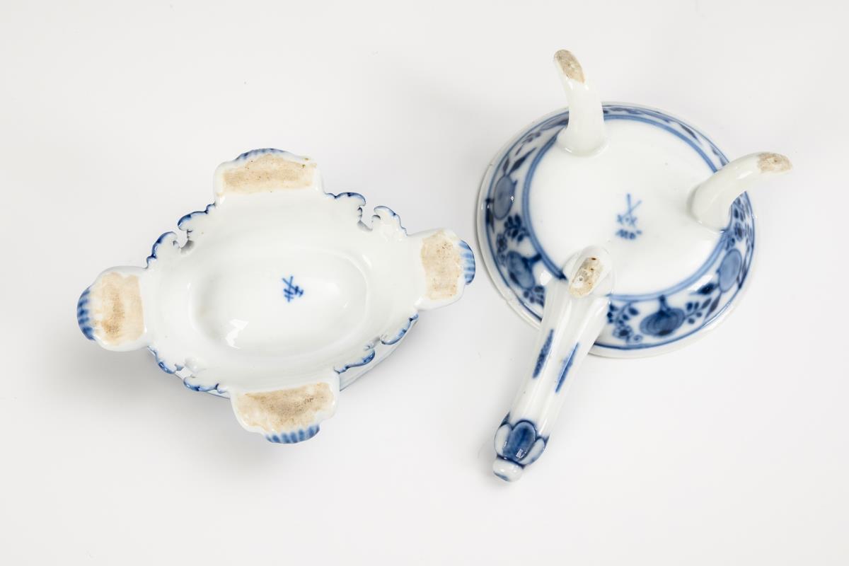 Baroque onion pattern saliere and egg jars. Meissen.
