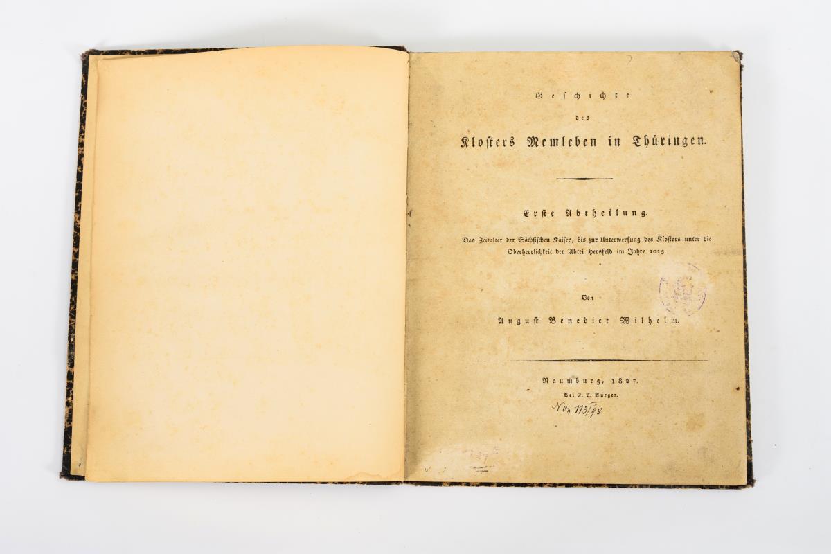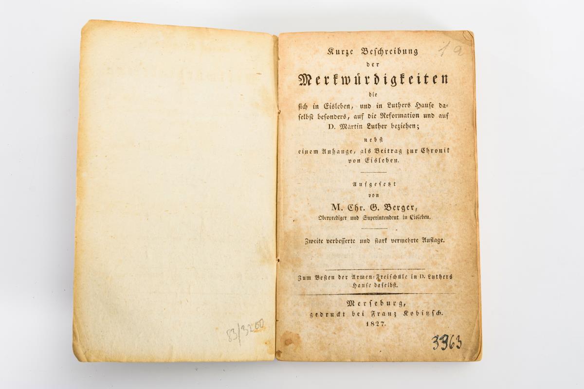 Berger, Chr. G.: "Kurze Beschreibung der Merkwürdigkeiten die sich in Eisleben, und in Luthers Hause daselbst besonders, auf die Reformation und auf D. Martin Luther beziehen, nebst einen Anhang, als Beitrag zur Chronik von Eisleben". merseburg 1827, gedruckt bei Franz Kobitzsch, 261 Seiten. / Hensoldt: "Die neue Stadt-Pfarr-Kirche in Sonneberg im Herzogthum Sachsen-Meiningen erbaut von Karl Heideloff", Nürnberg 1845, Verlag von Johann Adam Stein, 16 Seiten und 5 Tafeln. / Wilhelm, August Benedict: "Geschichte des Klosters Memleben in Thüringen", Naumburg 1827, 75 Seiten, 1 Plan. .