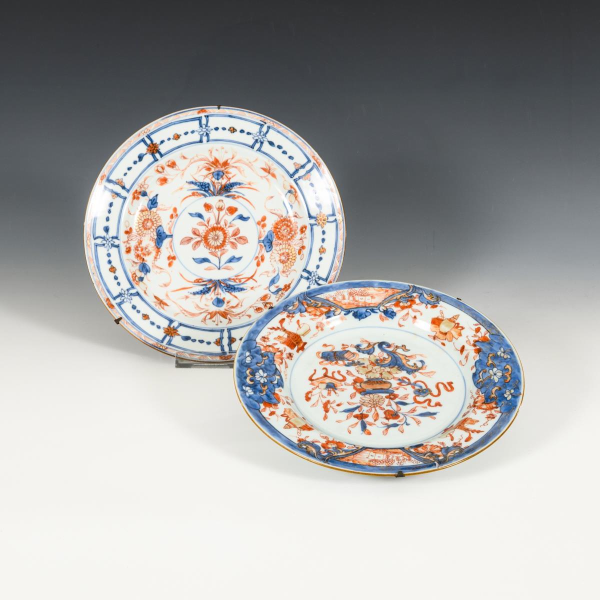 Plate with underglaze blue painting and red, partly gold-colored painting. One plate with slightly rubbed painting and hairline crack in the glaze on the base. Underside with subtle plant decoration. Both with wall mounts.