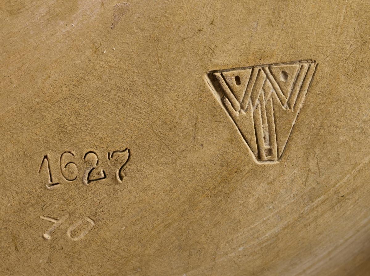 Press mark, after 1910 to 1930. model no. 1627 40. verso incised "F. Sautner". Design: Franz SAUTNER (1872 Reichenau an der Maltsch/Bohemia - 1945 Rodaun near Vienna, Austrian painter and sculptor, studied at the Vienna Academy). Light body, matt green glaze. 5 x 18 x 12 cm.