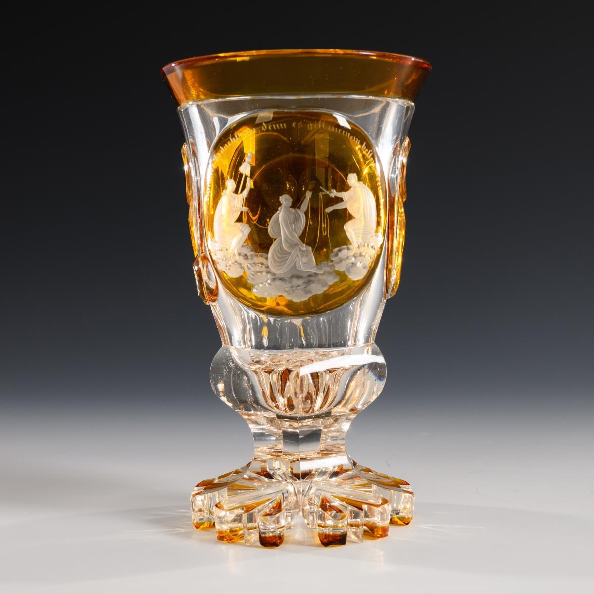 Bell-shaped dome with lens cut, six-pass dome base and multi-pass foot. On the front a high-cut medallion with the engraved depiction of the three Parzen and the inscription "Spinnet bedachtsam denn es gilt meinem besten Freunden.", verso a high-cut medallion with a lenticular rosette. Foot rim minimally bumped.