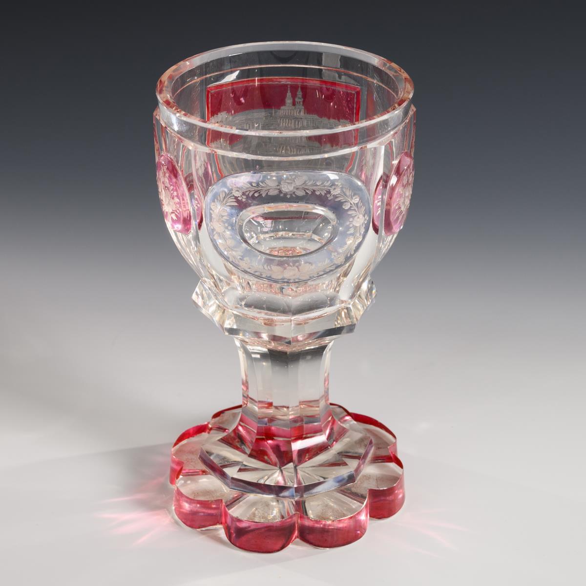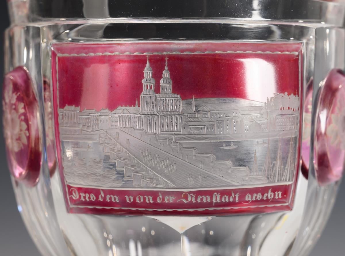 Facetted bell-shaped dome, faceted shaft and multi-pass base. On the dome, high-cut lenses with engraved flower bouquets, on the front a high-cut cartouche with the engraved view of "Dresden von der Neustadt gesehn.". Chip and small chips to the foot rim.