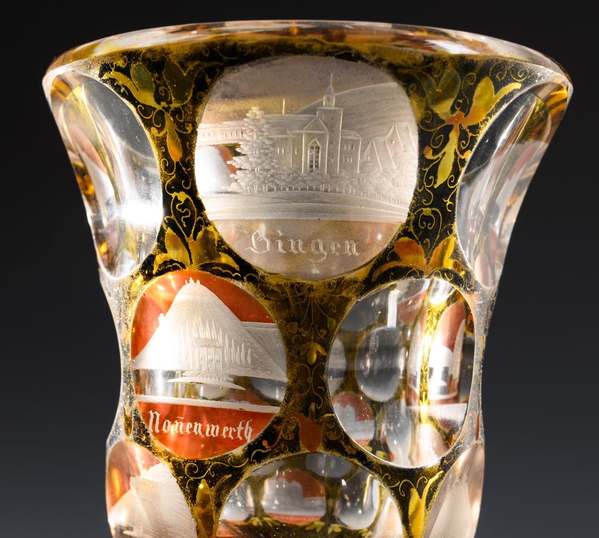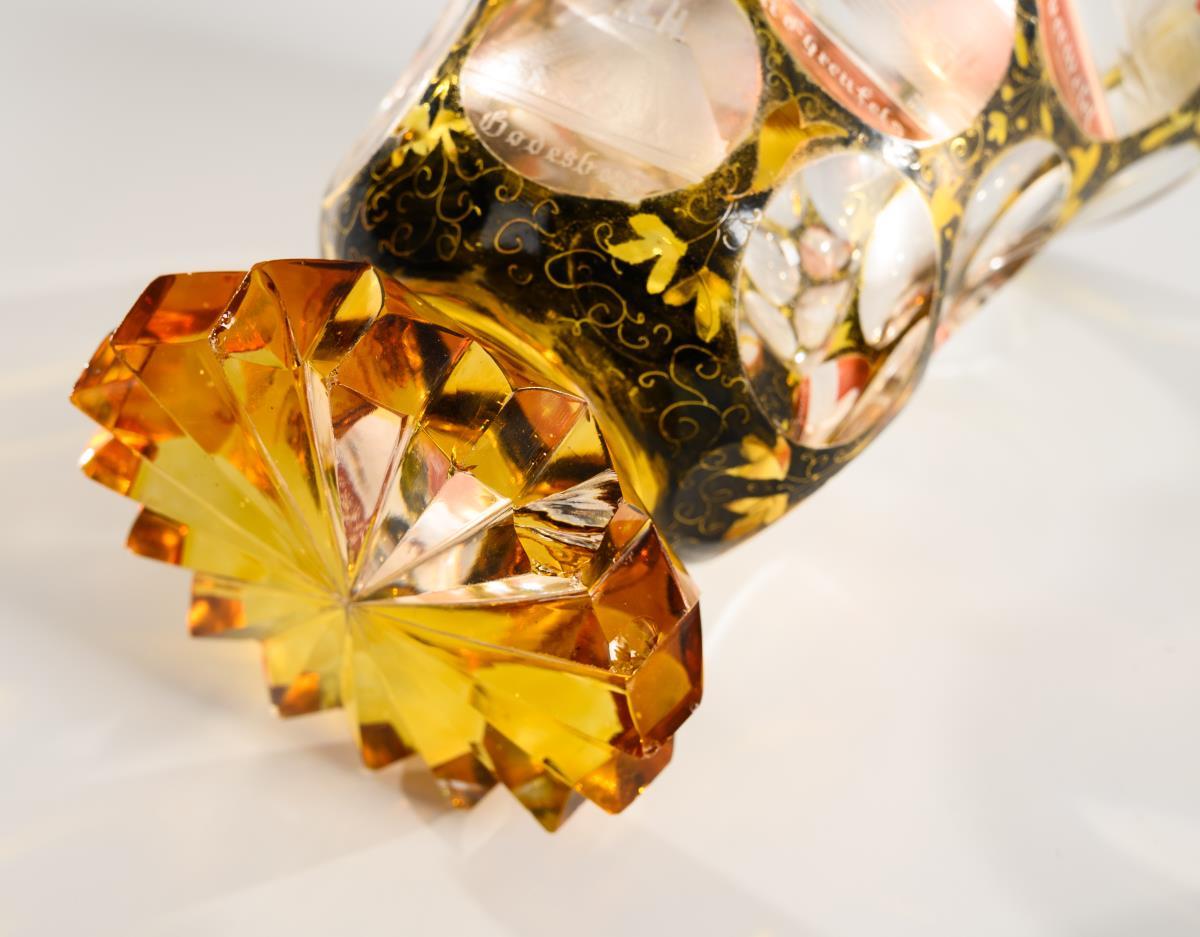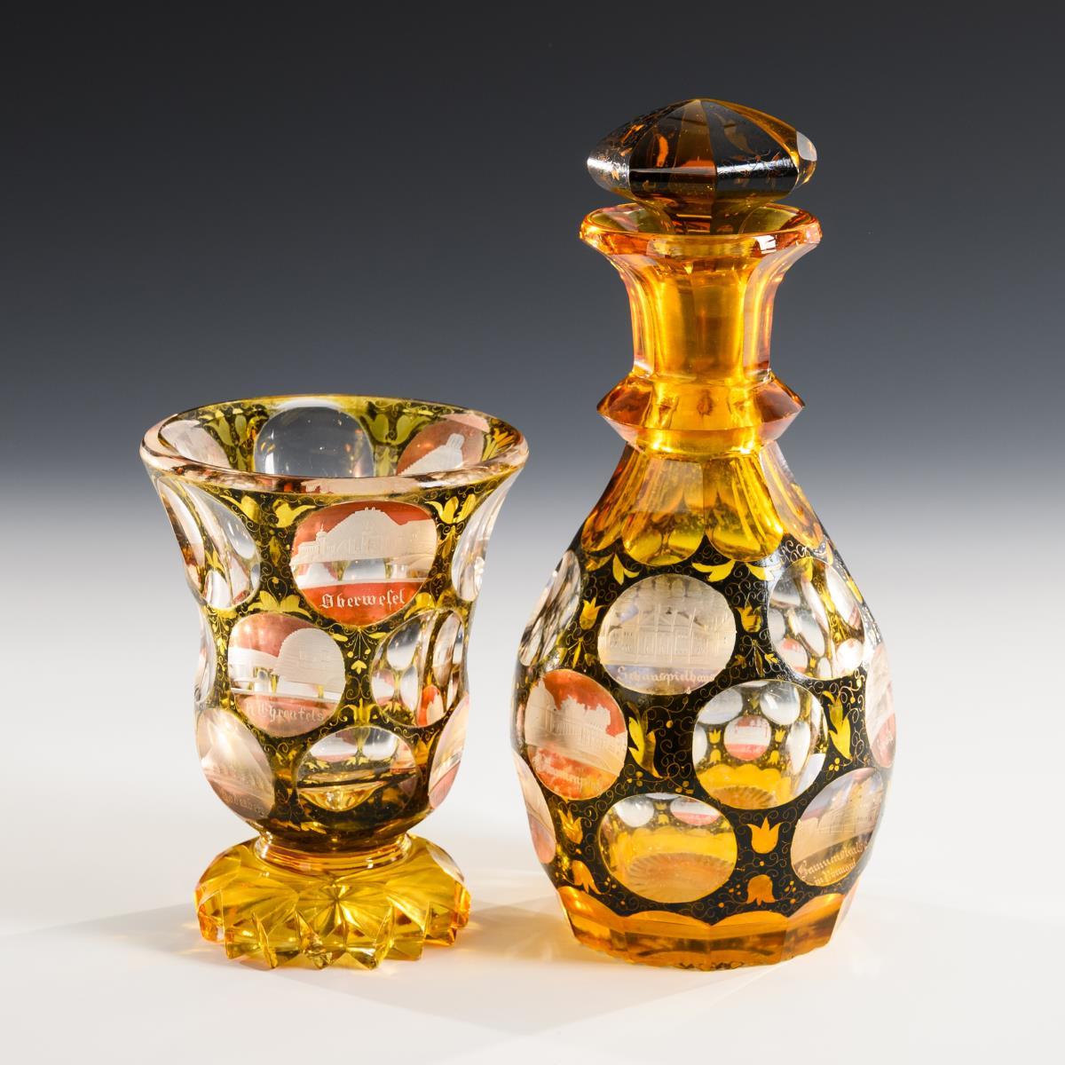 Carafe and foot cup made of colorless, partially stained amber and pink, black solder painting with needle-engraved leaf decoration, engraved views of the Rhine and views of Bad Pyrmont in cut lenses. Bumps on the foot of the cup, chip on the inner stopper end.