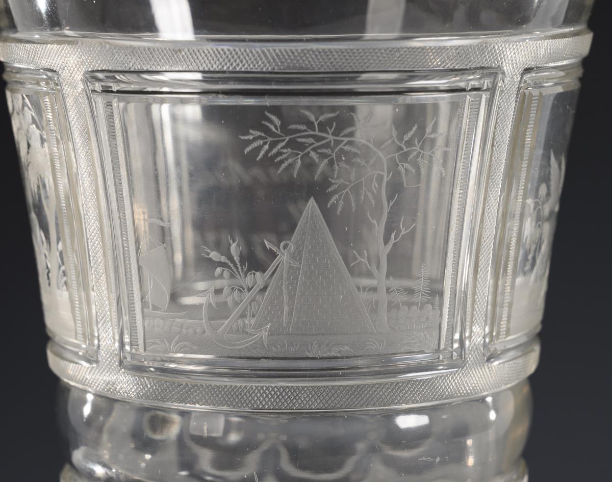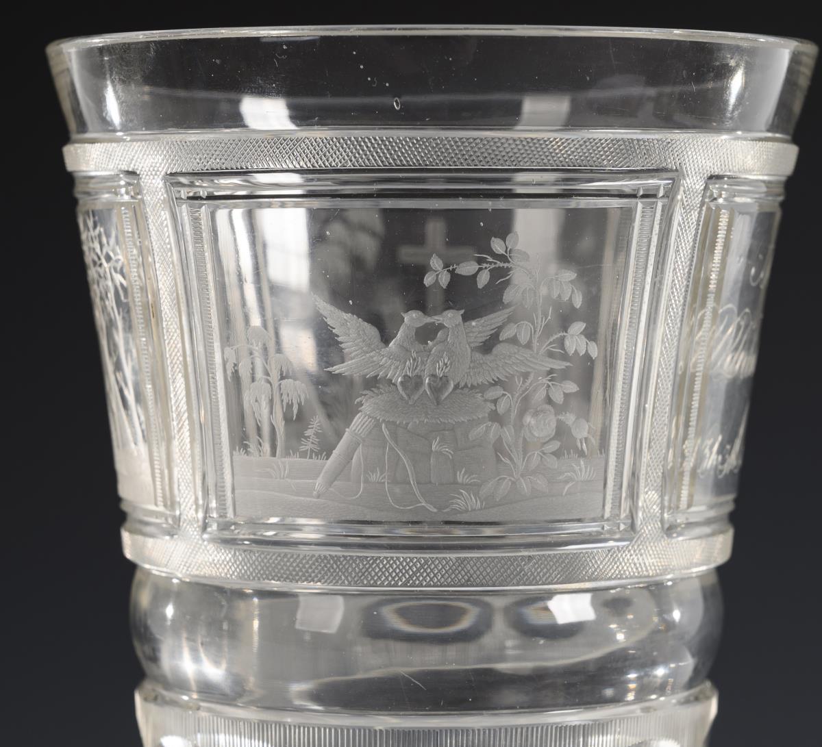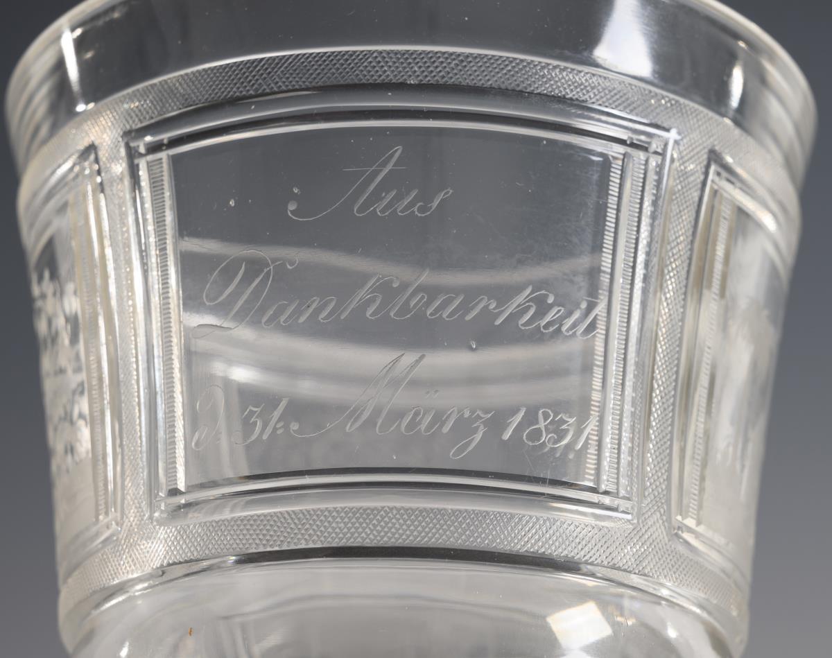 Concave vase with facet, notch, lentil and stone-cut decoration, dislocated neck. With four cut rectangular cartouches with engraved depictions of faith, love and hope as well as the inscription "Aus Dankbarkeit d. 31. März 1831.".