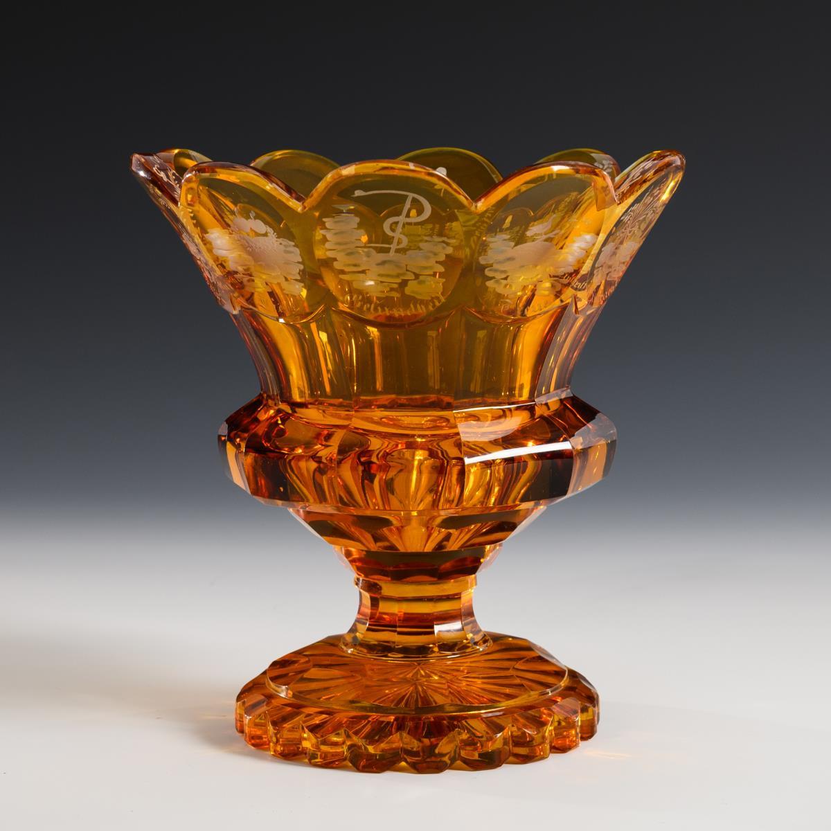Ten-facetted kraterkuppa with multi-faceted rim, stepped base, faceted shaft and multi-faceted foot. Engraved symbol arrangements in cut lenses ("Faith, hope, love, health, loyalty, unity, happiness and joy prolong your life". 1 knock to the rim of the mouth, 2 minimal knocks to the foot rim.