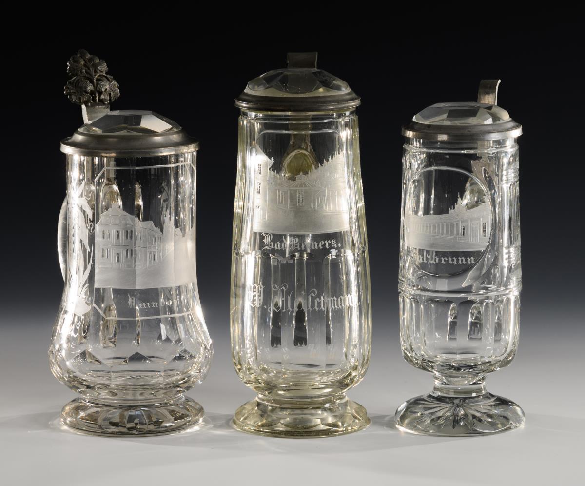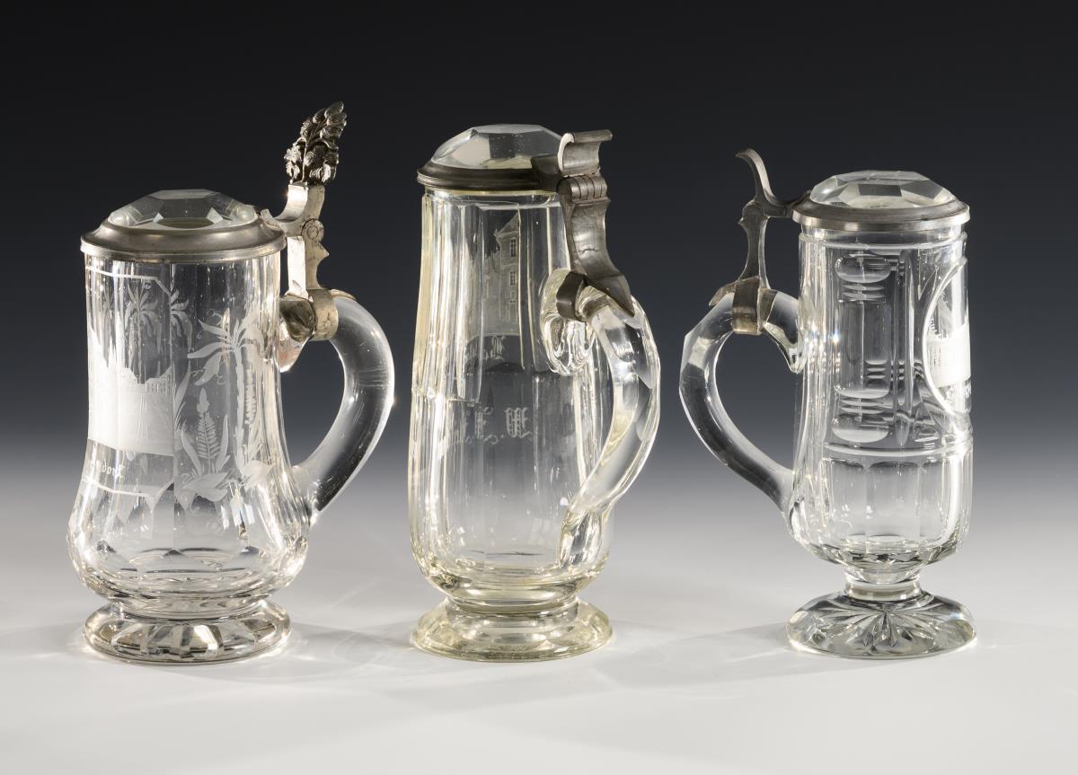 Faceted jugs with pewter-framed glass lids and engraved views on the front (Reinerz, Salzbrunn, Nenndorf).