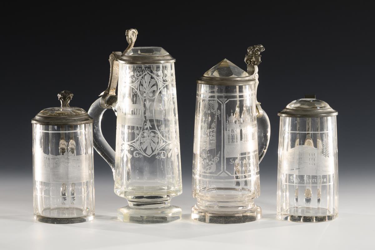 Faceted, conical jugs with pewter-mounted hinged lid. With various engraved views (Bad Oeynhausen, Bad Kreischa, Karlsbad, Marienbad). Some with engraved names or monograms. 1x knocks to the stand.