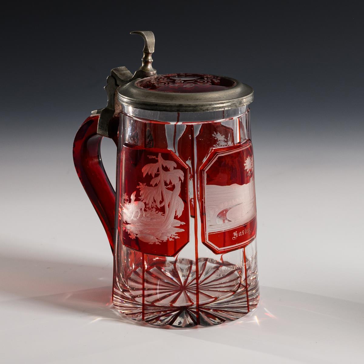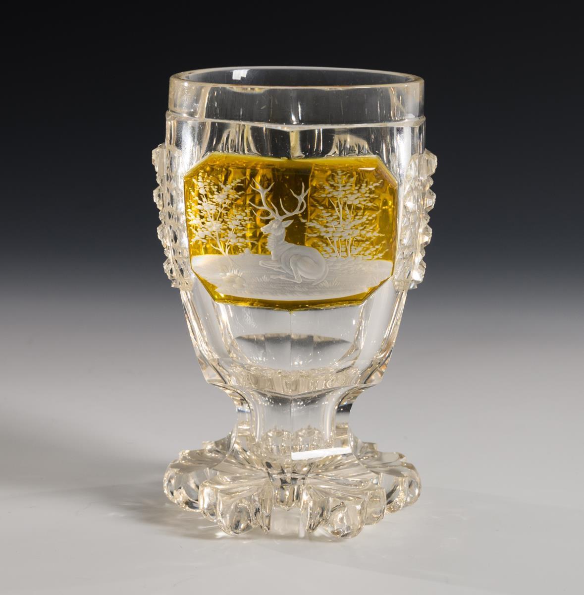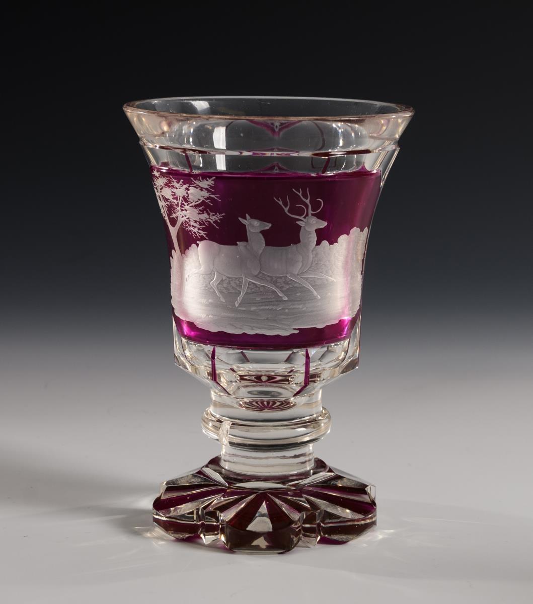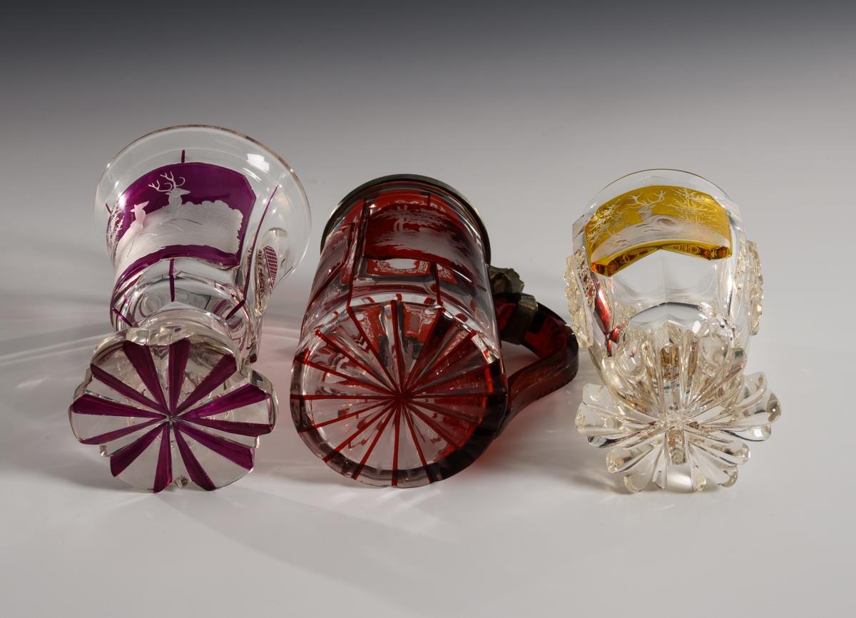 1x conical, faceted beer jug of colorless, partly red-glazed glass with pewter-set glass lid (h 15.5 cm). / 1x goblet made of colorless, partly violet glazed glass with faceted crater dome and high-cut pointed ovals and a rectangular cartouche (H 14.5 cm). / 1x goblet of colorless, partly yellow stained glass with facet, notch and stone cut (H 13.5 cm). All with engraved hunting motifs. 2x minimal knocks to the foot rim.