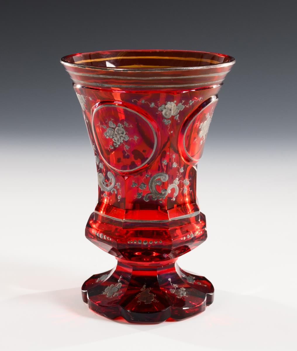 Facetted glasses, including 2 beakers with engraved and silver- and gold-decorated views of Bad Pyrmont and Hanover and 1 goblet with silver-painted scattered flowers and rocailles. Gold and silver partly rubbed.