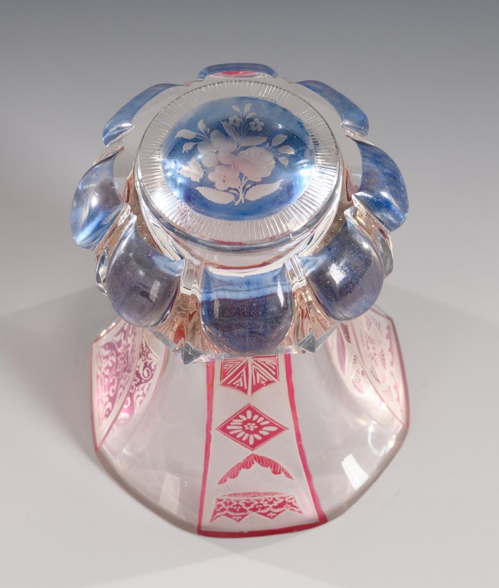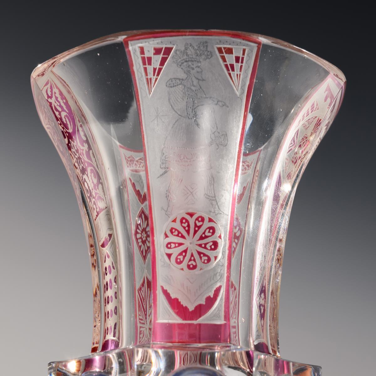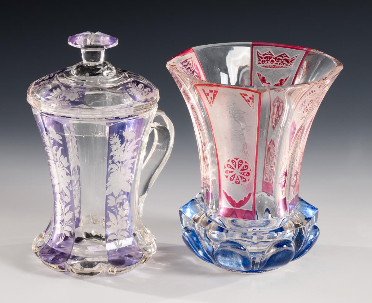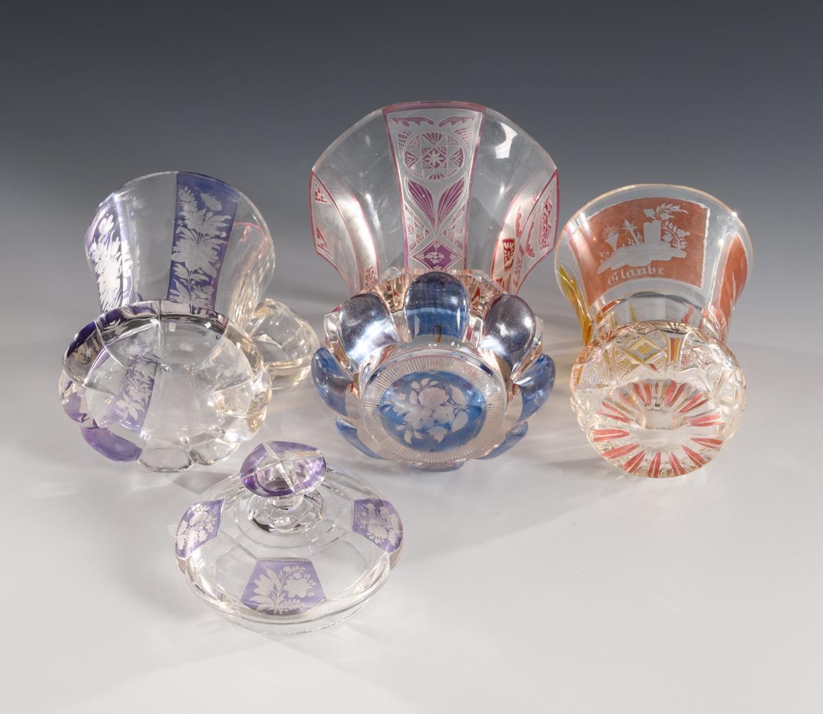 1x faceted, partially violet glazed mug with knob lid and engraved flower bouquets (h 15.5 cm). / 1x partially yellow and red glazed footed beaker with facet, notch and stone cut and engraved symbol arrangements "Faith, Hope and Love" (H 11 cm). / 1x large, partly pink and blue glazed footed beaker with faceted wall, high-cut tongues on the stand, engraved ornaments and an etched depiction of a lansquenet (H 13 cm). Bumps to the inside rim of the lid, 1x minimal bump to the rim of the mouth.
