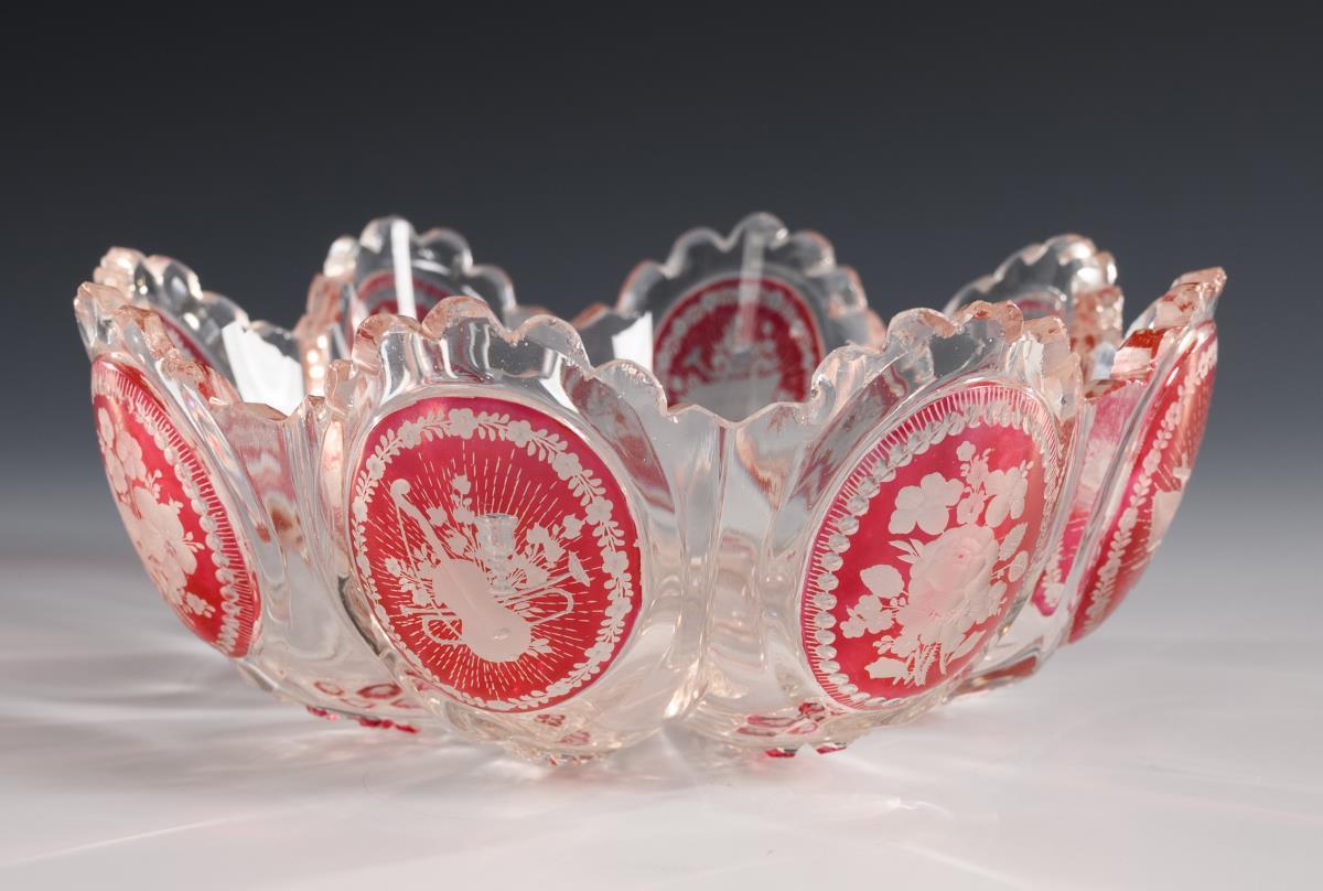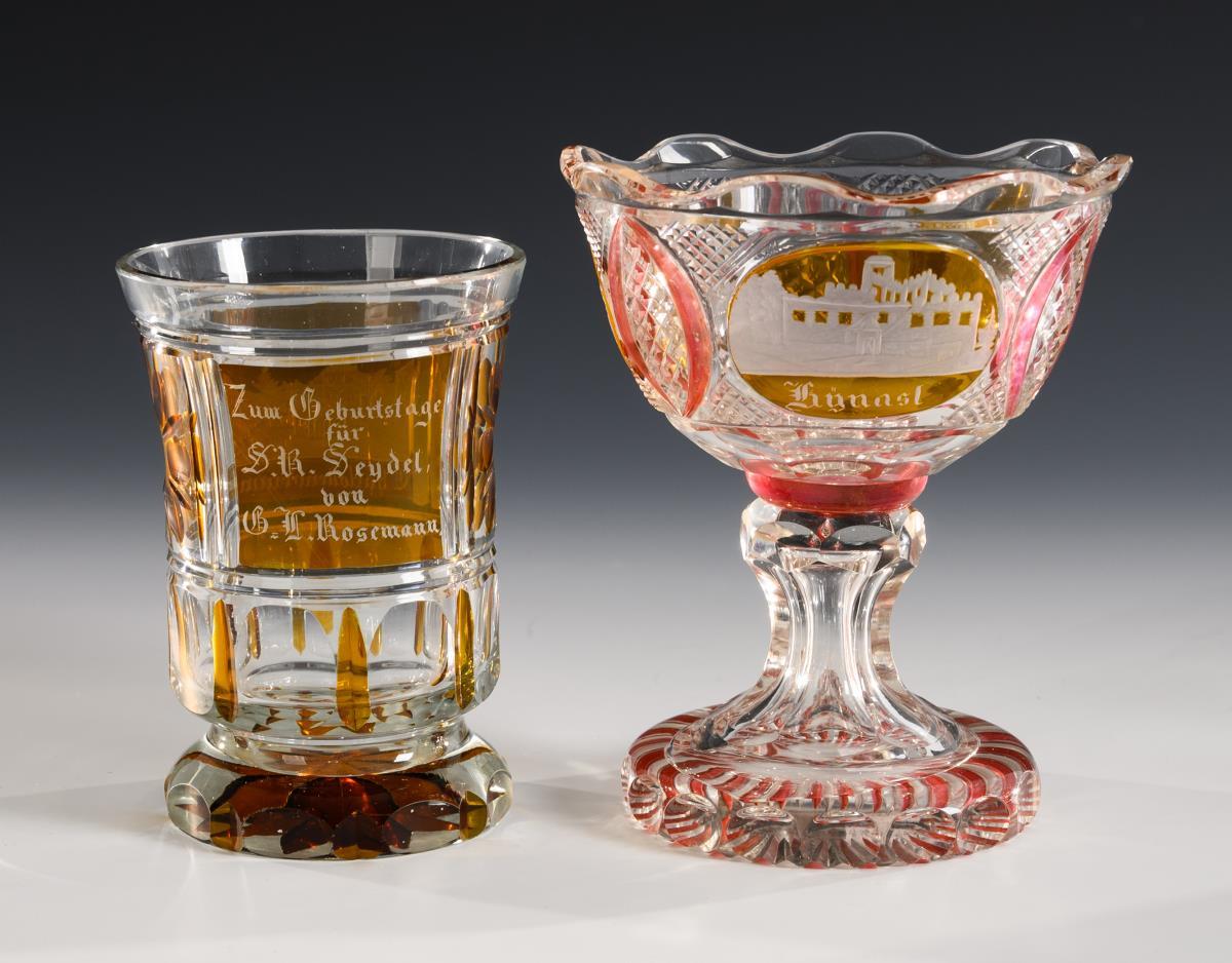 1x eight-pass bowl with engraved flower bouquets, symbol arrangements and stone carving (Ø 15 cm). / 1x footed cup with notch and lentil cut and an engraved view of Charlottenbrunn (h 11.5 cm). / 1x footed bowl with notch and lentil cut and three engraved views (Kynast, Warmbrunn, Landhausen; h 13.5 cm). Bumps to the rim of the bowl and the feet of the view glasses.