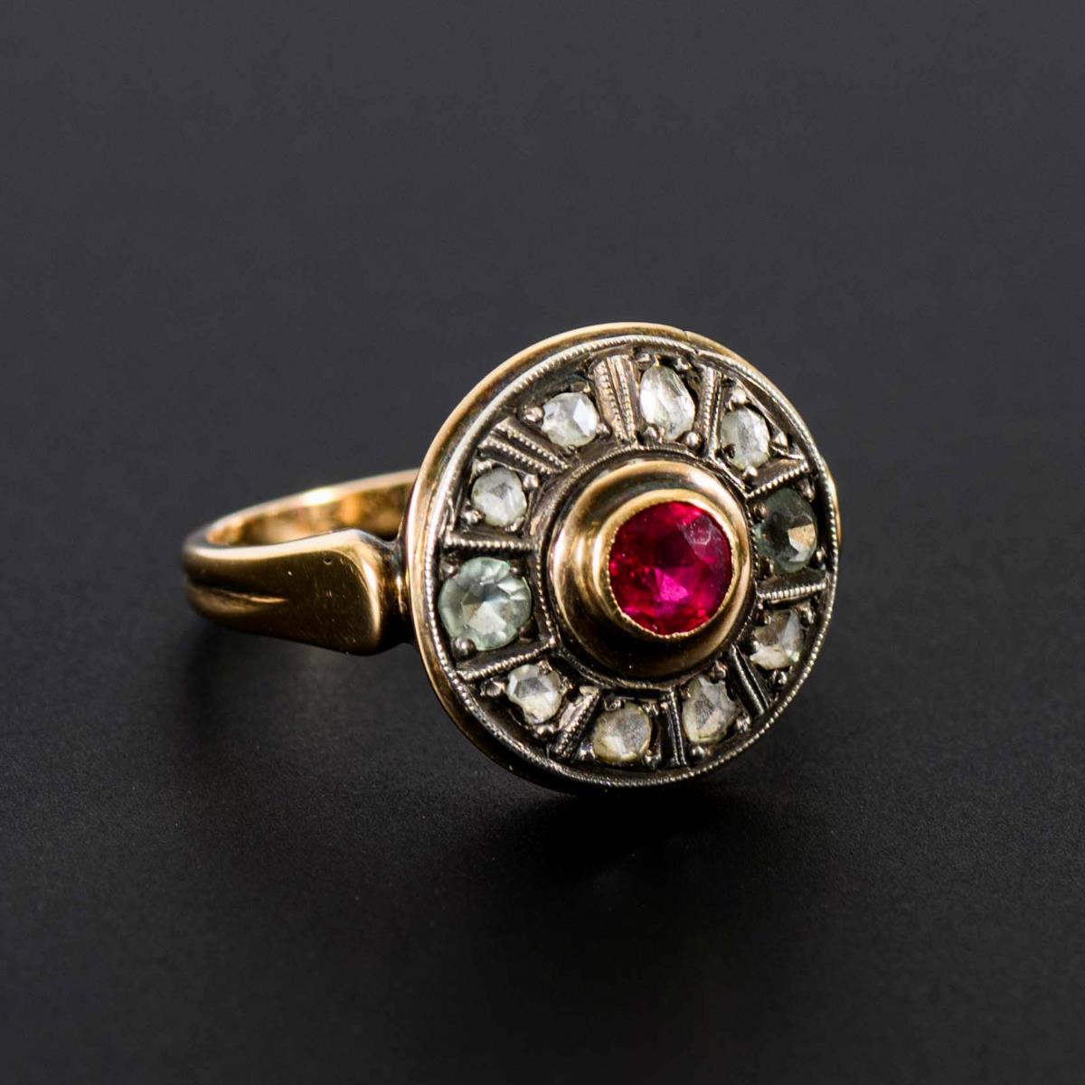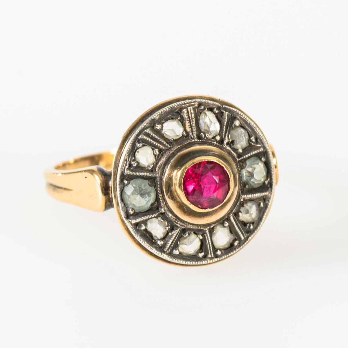 Bezel-set ruby, surrounded by 8 small diamonds, between a narrow rail. 2 additional stones, probably rock crystal.