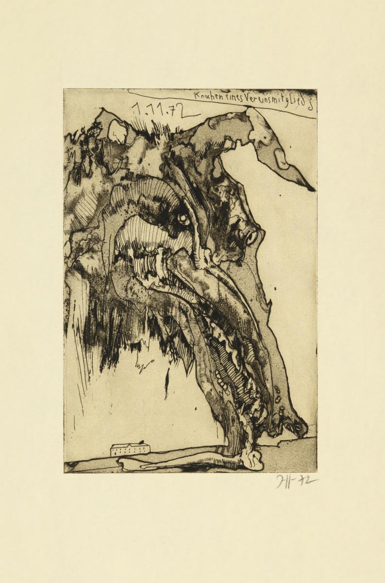 "Kopfweide", Griffelkunst 1974 | "Ein Glas mit vertrockneten Weintrauben", Griffelkunst 1972 | Untitled, Griffelkunst 1975 | Untitled, [19]71 | "Knochen eines Vereinsmitgliedes", Griffelkunst 1972 | "Tantchen Memo", Griffelkunst special sheet 1971 | Self-portrait "Blückers Gedächtnis", Griffelkunst 1972 | "Vor Holm", Griffelkunst 1972 | "Rest", Griffelkunst 1972 | Untitled, Griffelkunst 1972.