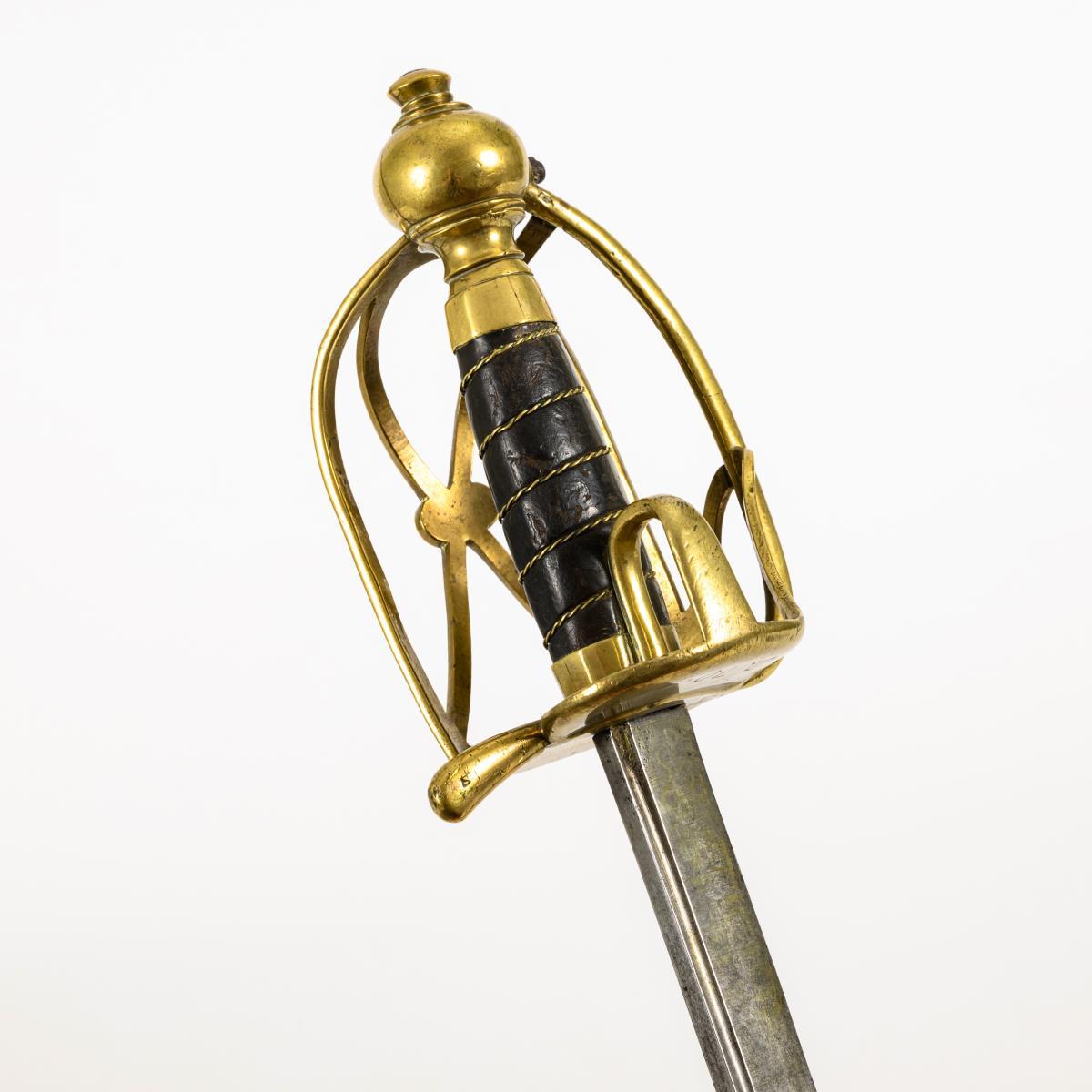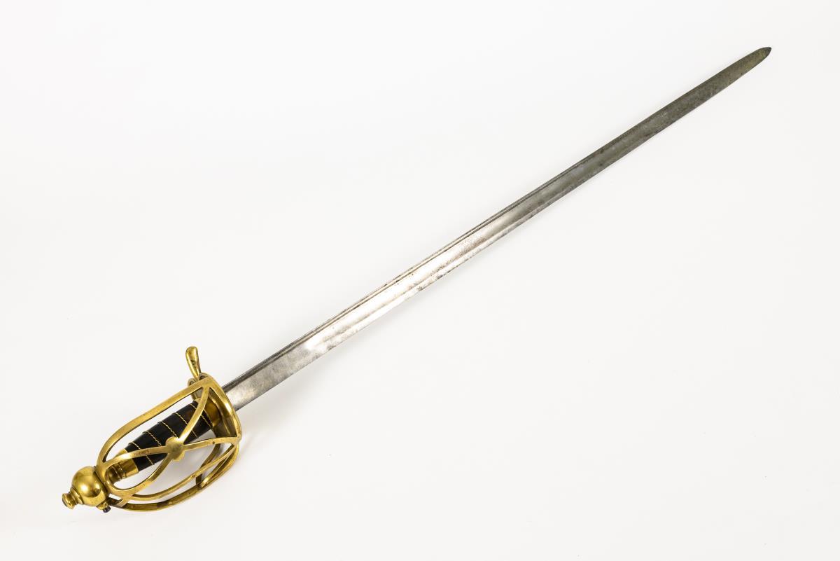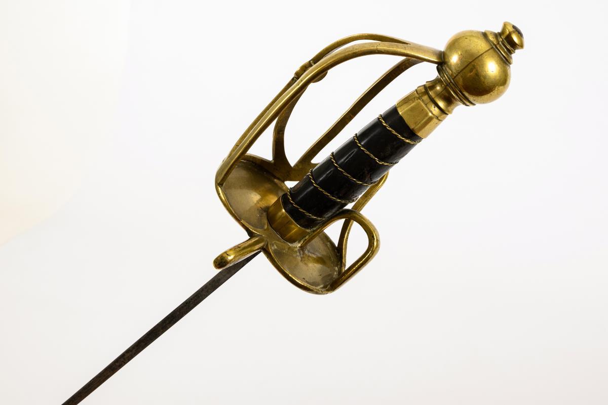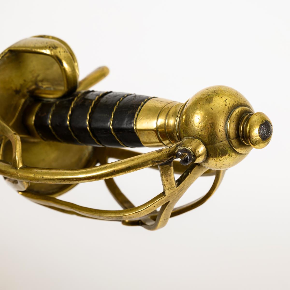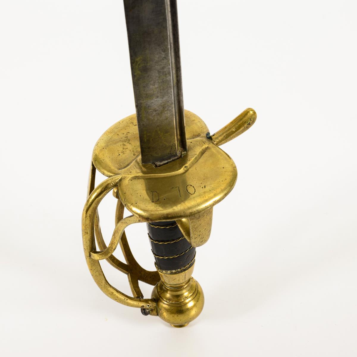 Straight, single-edged blade with wide fuller. Brass hilt with several intersecting clasps, thumb grip and large ball pommel. Leather-wrapped wooden grip with twisted wire winding. The underside of the double, kidney-shaped guard plate is stamped "D.70". Leather winding somewhat defective, blade with a weak bend. Tang hole larger than the tang.