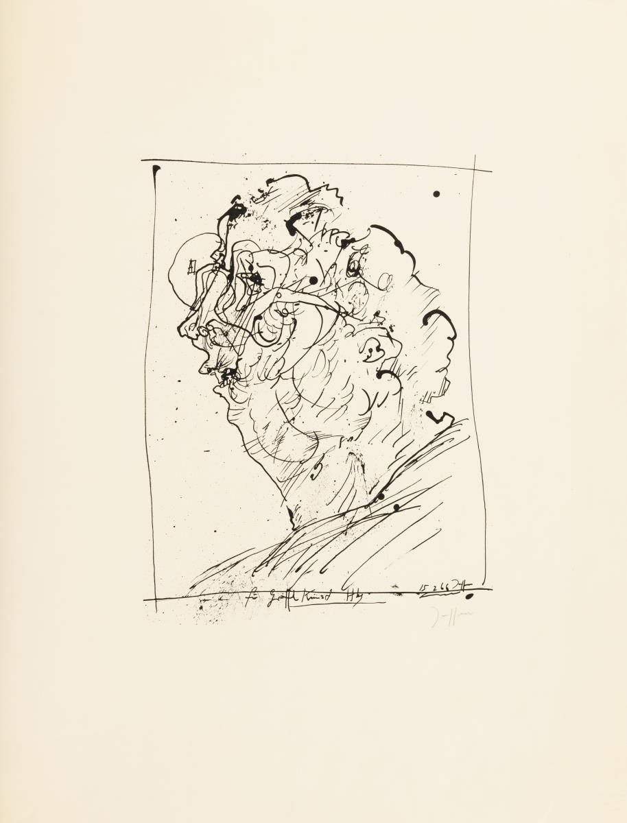 "Scherz mit Postma", [19]68, pencil signature of both artists (Horst Janssen and Hannes Postma) | "Greta Stolterfoht", [19]71, pencil monogram | "Liebe Gesche - so liebt mich Oskar - Ja", [19]71, pencil monogram | "Für Griffelkunst", dated in print: 1966, pencil signature, somewhat creased.