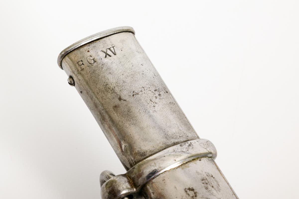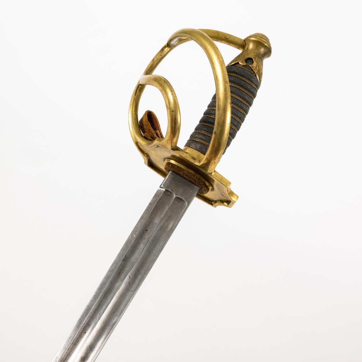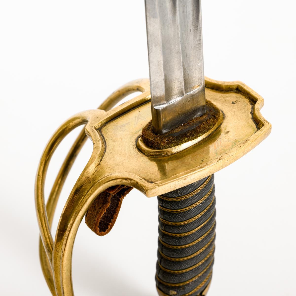 Straight, single-edged blade with inspection mark (crowned A) on the back of the blade. Two parallel ricassos. Three-bar brass hilt with the same inspection mark, leather loop for thumb, checkered grip and triple wire winding. / Metal scabbard with hallmark: "F.G. XV" and two suspension rings.