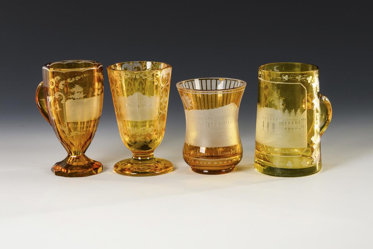 1 jug, 1 mug, 1 beaker and 1 goblet with engraved views (Baden-Baden, Bad Kreuznach, Nenndorf). Minimal wear to the rim of the jug and the mug.