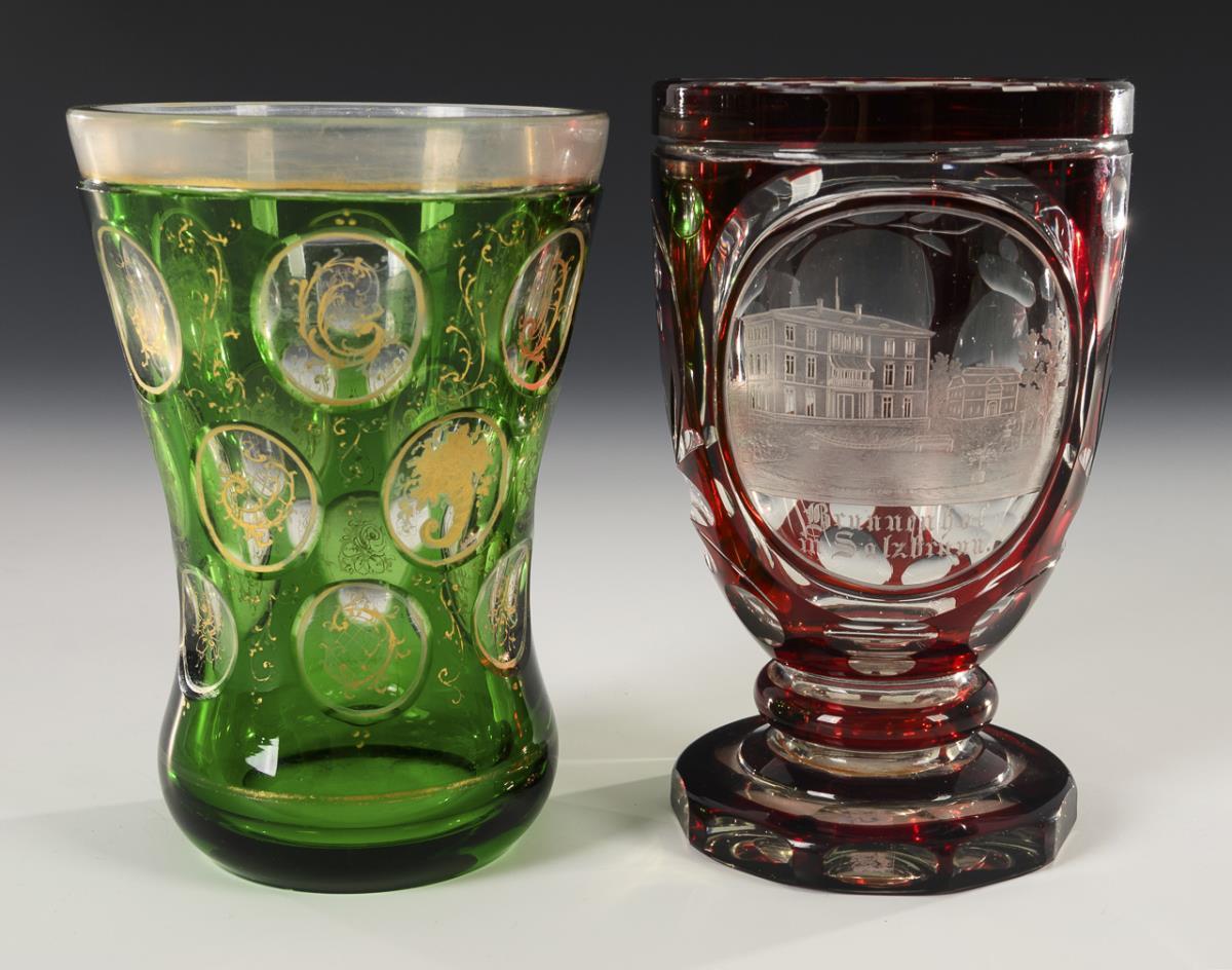 2 footed beakers of colorless glass with red overlay: 1x with floral cut decoration and an engraved view of Salzbrunn; 1x with notch and facet cut and engraved views of Teplitz / 1 beaker of colorless glass with green overlay, lentil cut and gold-painted ornamental decoration. 1x gold rubbed, 1x with minimal edge wear.